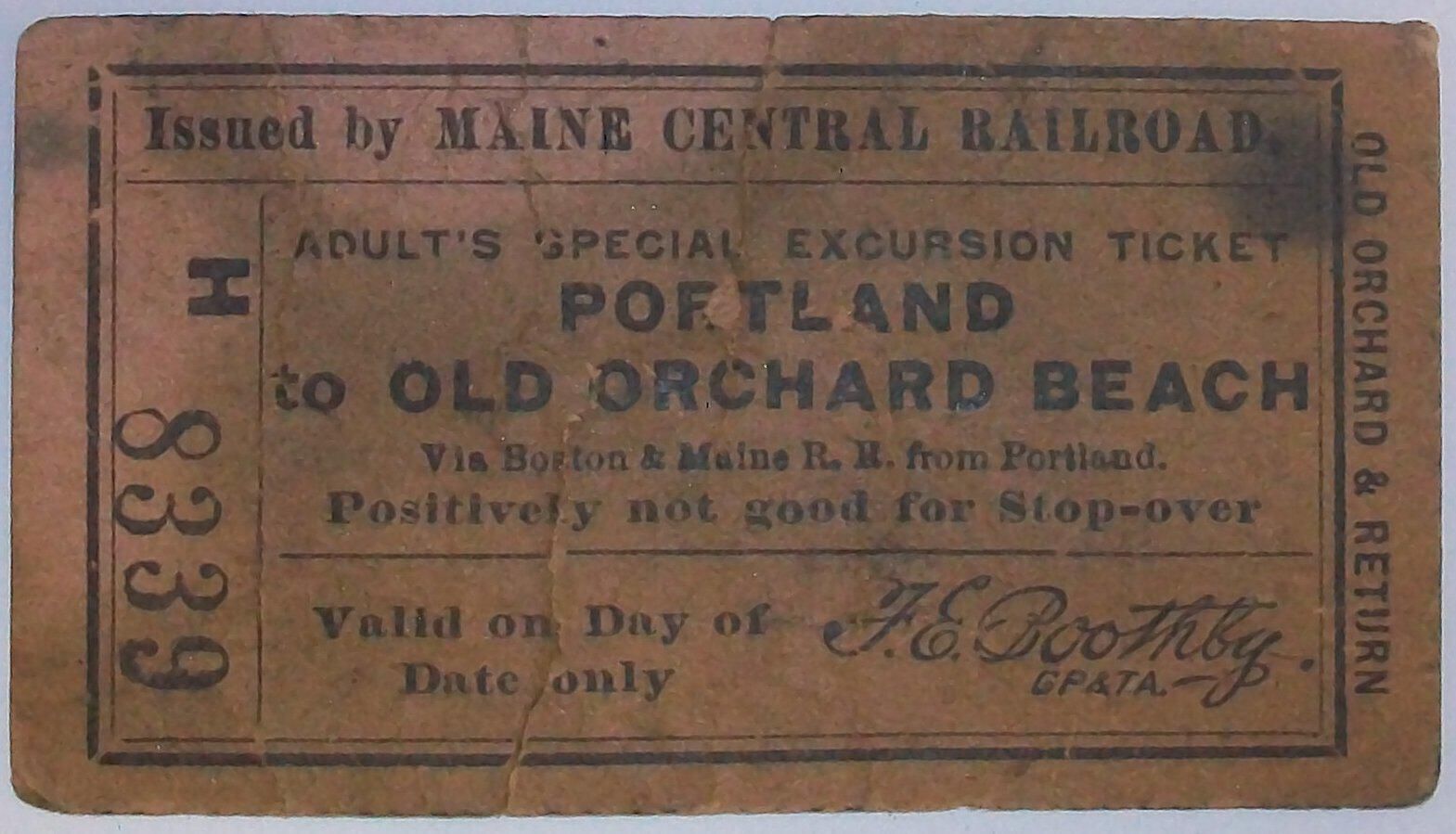 Round trip train ticket from Portland to Old Orchard Beach vis. Boston & Maine R.R. issued by Maine Central Railroad, ticket number H 8339. Date stamp on reverse faded and unreadable. Piece of paper handwritten "Stamp Date Aug. 19, 1889, Purchased in Rockland, Me."Dimensions