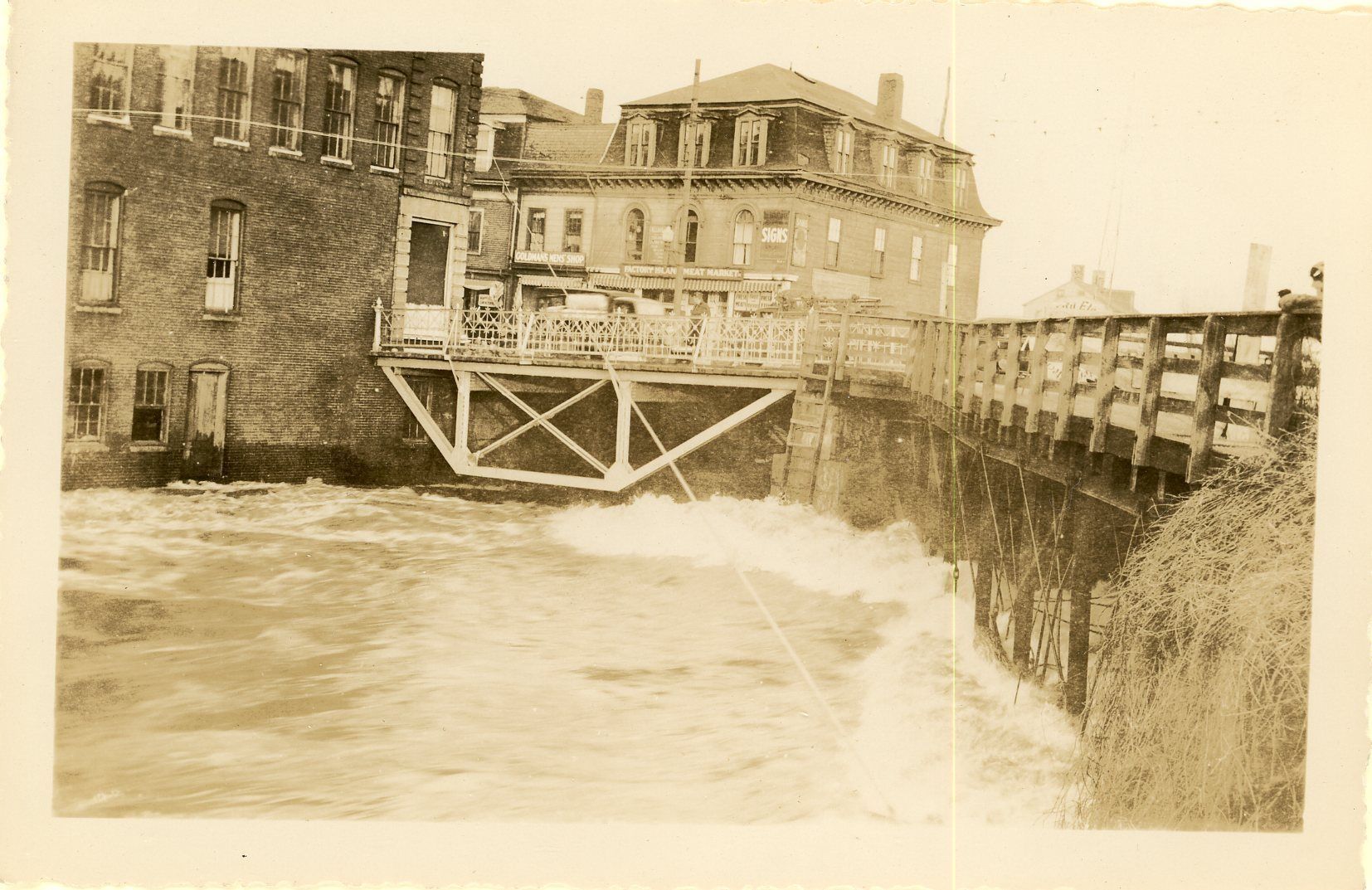 Black and white print photograph of Saco River flooding in Saco, Maine on Factory Island Main Steet. From the Sawyer House Collection.