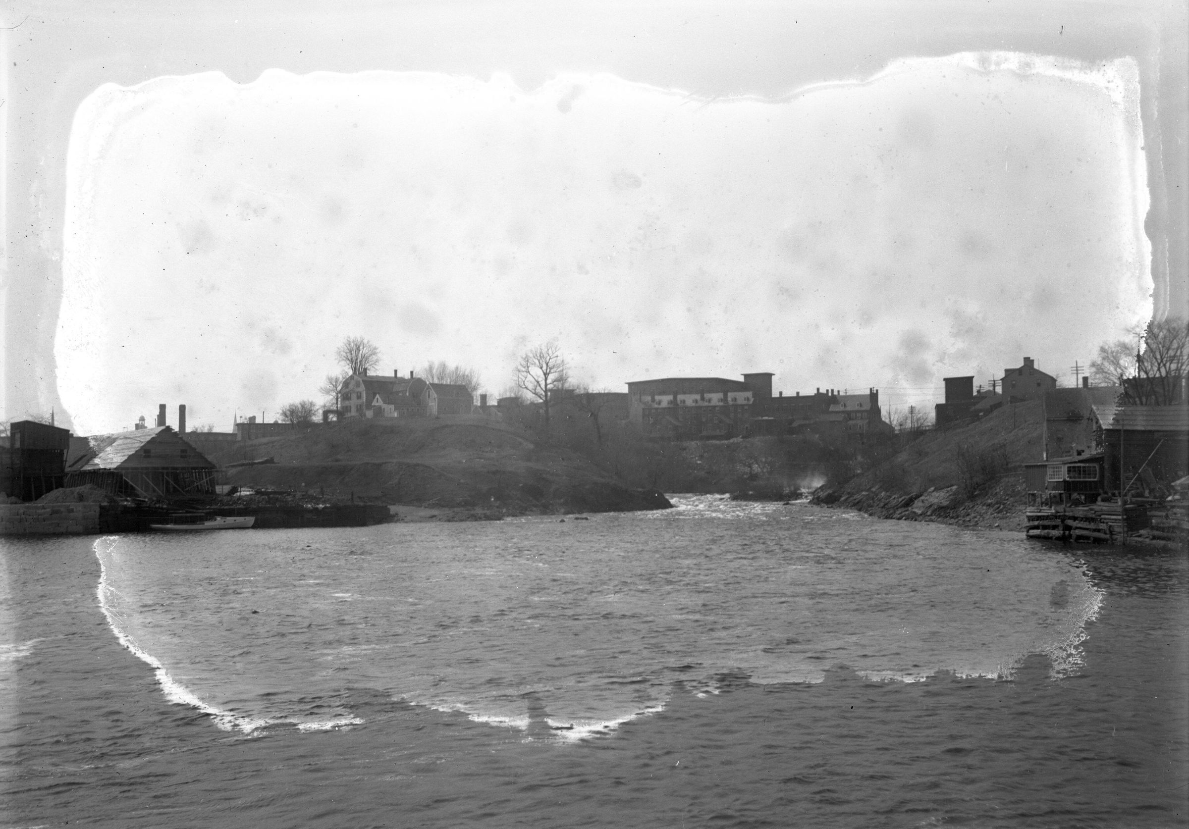 Glass plate negative photo of the Saco River. Colonel Cutts House can be seen to the left.