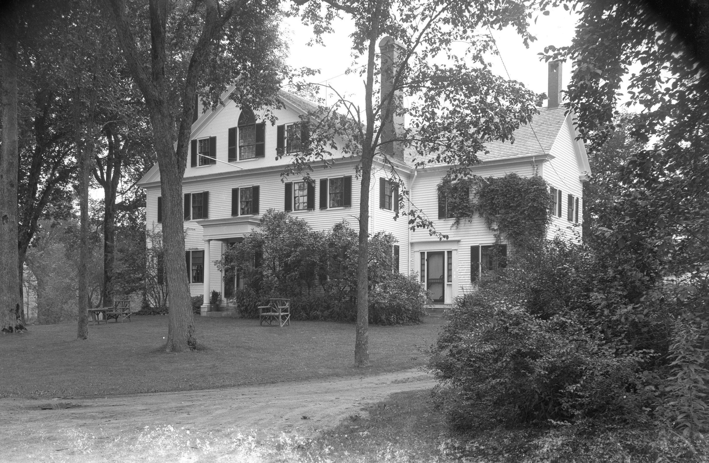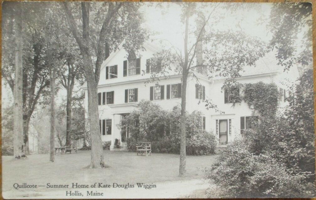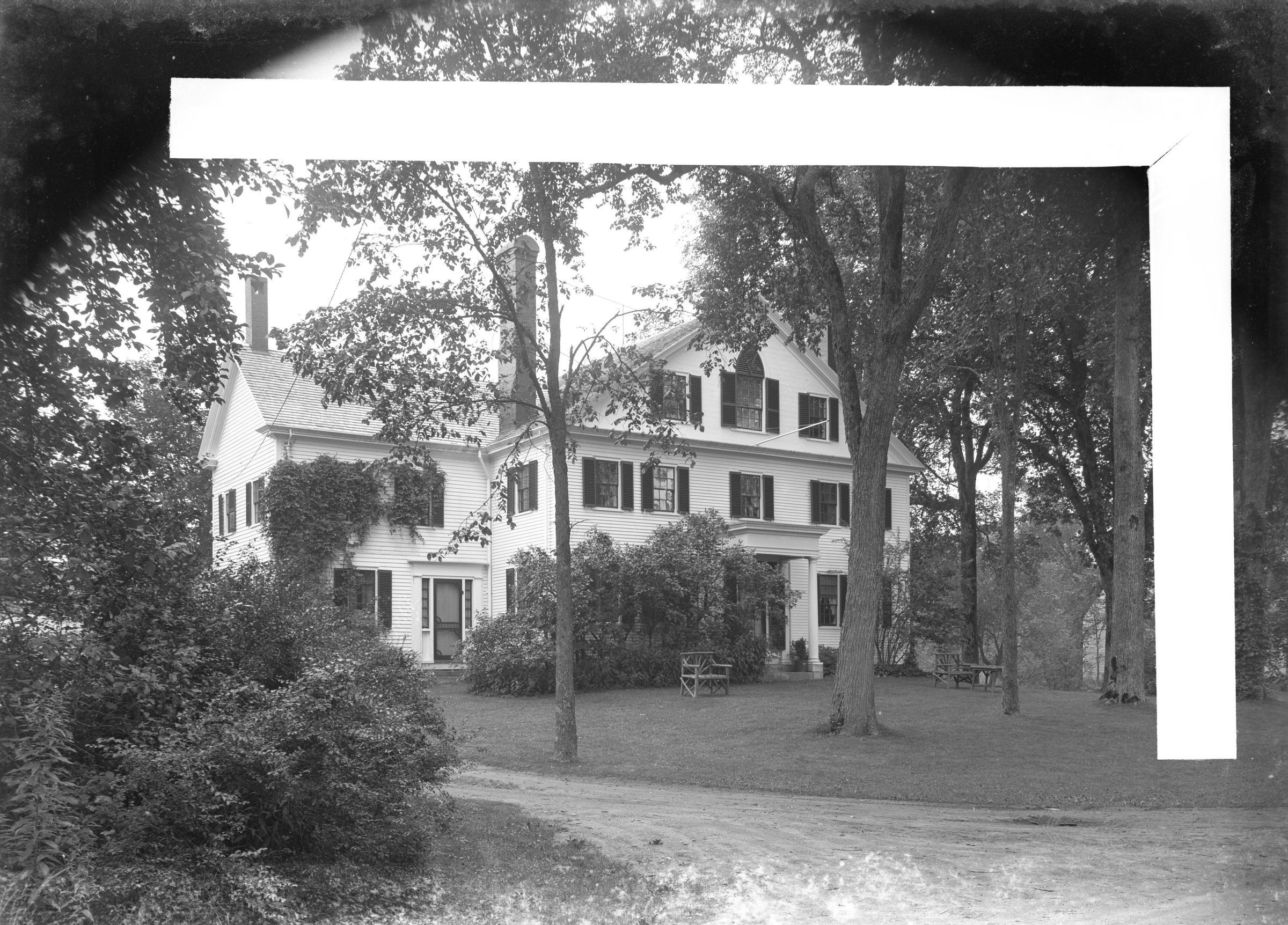 Glass plate negative photo of the Quillcote house, author Kate Douglas Wiggin's residence in Hollis, Maine. The back side of the negative has a section of a postcard pasted on. "Aug 10, 1928," is written in pencil on the postcard section. The photographer Bradbury was likely sizing these photos to create postcards. The date(s) written in pencil is likely the processing date(s) and not the date the actual photo was taken. Many of these postcards of Quillcote are still widely available today and sold by antique ephemera dealers.Made/Created