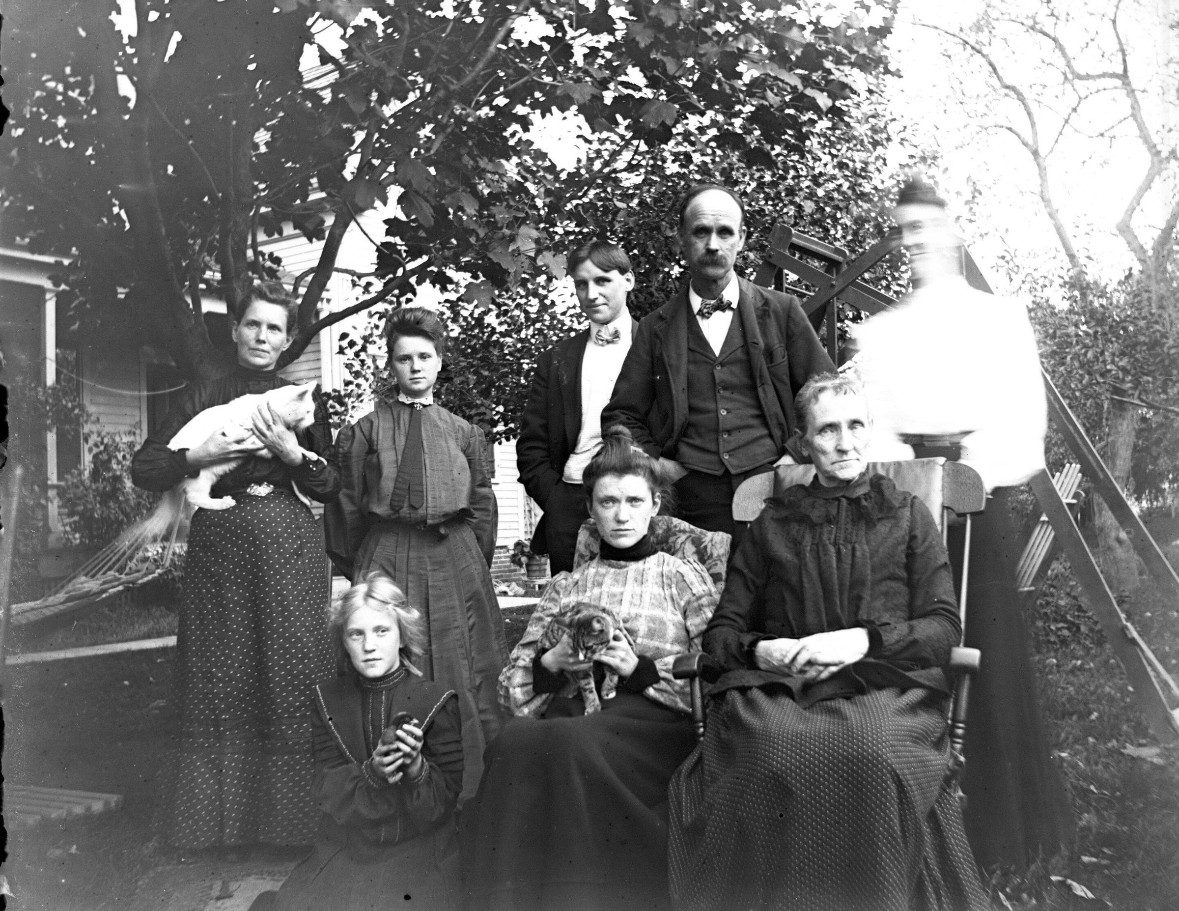 Glass plate negative photo of the Young family (and their cats). Back row, from left to right: Ida May Hallett Young, Mildred "Millie" Etta Young, unidentified male, Clarence L. Young, and Cora Ethyl Young Hobbs (blurred). Front Row, from left to right: Esther Carroll Young, Lewie Francis Young, and Caroline Smith Young.