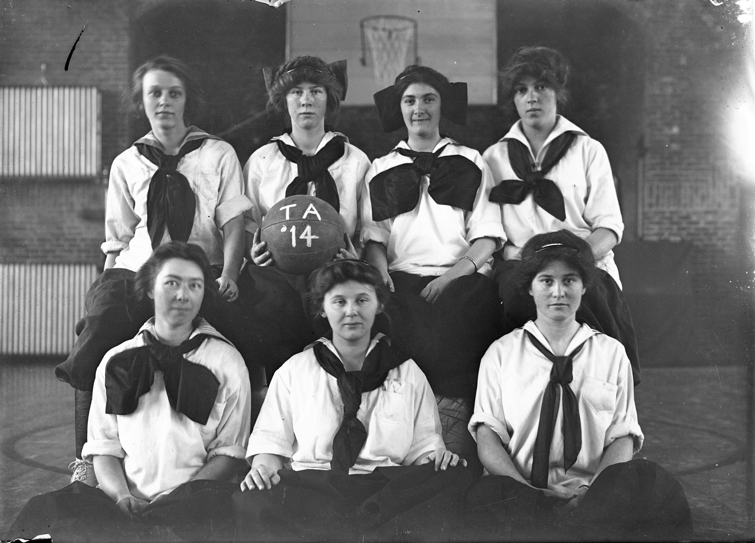 Glass plate negative (yellow tinted) photo of Thornton Academy girls basketball team posing for a group photo. "TA '14" is painted on the ball.