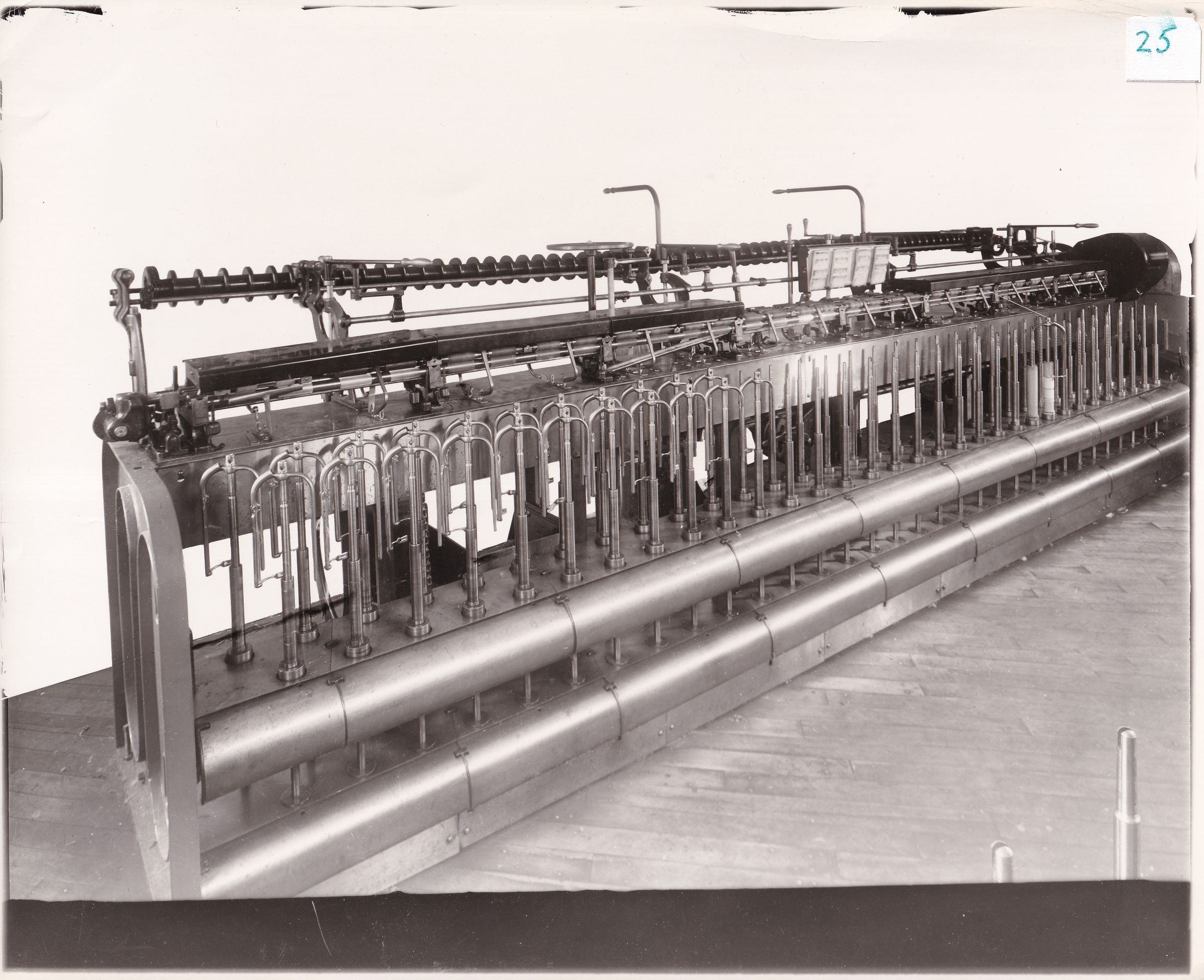 An empty spooler. The spoolers converted the sliver from the carding machines into fiber for the roving machines and beyond.Made/Created