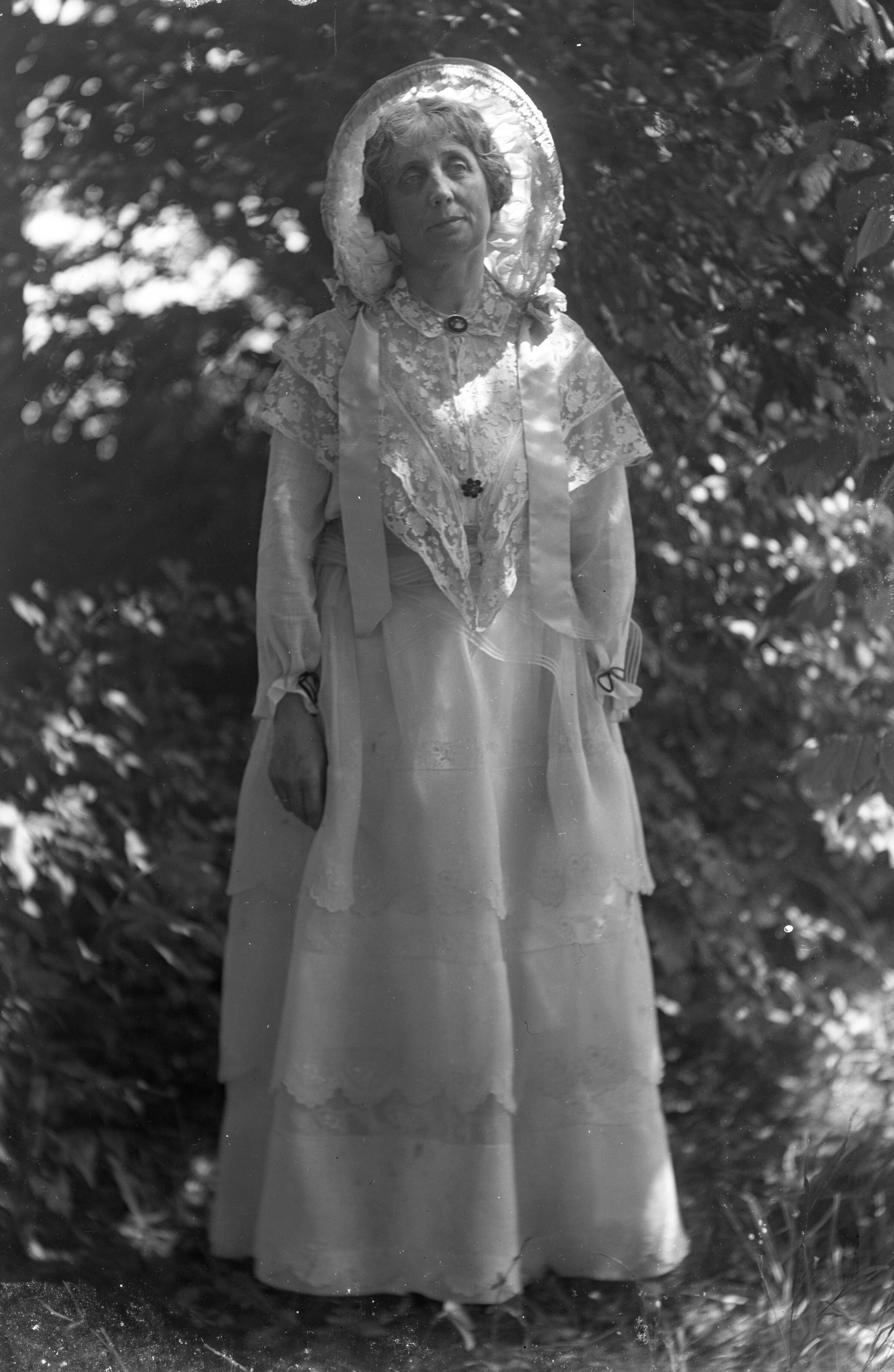 Glass plate negative photo of Maud Bradbury. Likely dressed up in costume for The Old Peabody Pew, a play written by Kate Douglas Wiggin. Maud Bradbury was a veteran actor in the annual play and eventually become the director.Made/Created