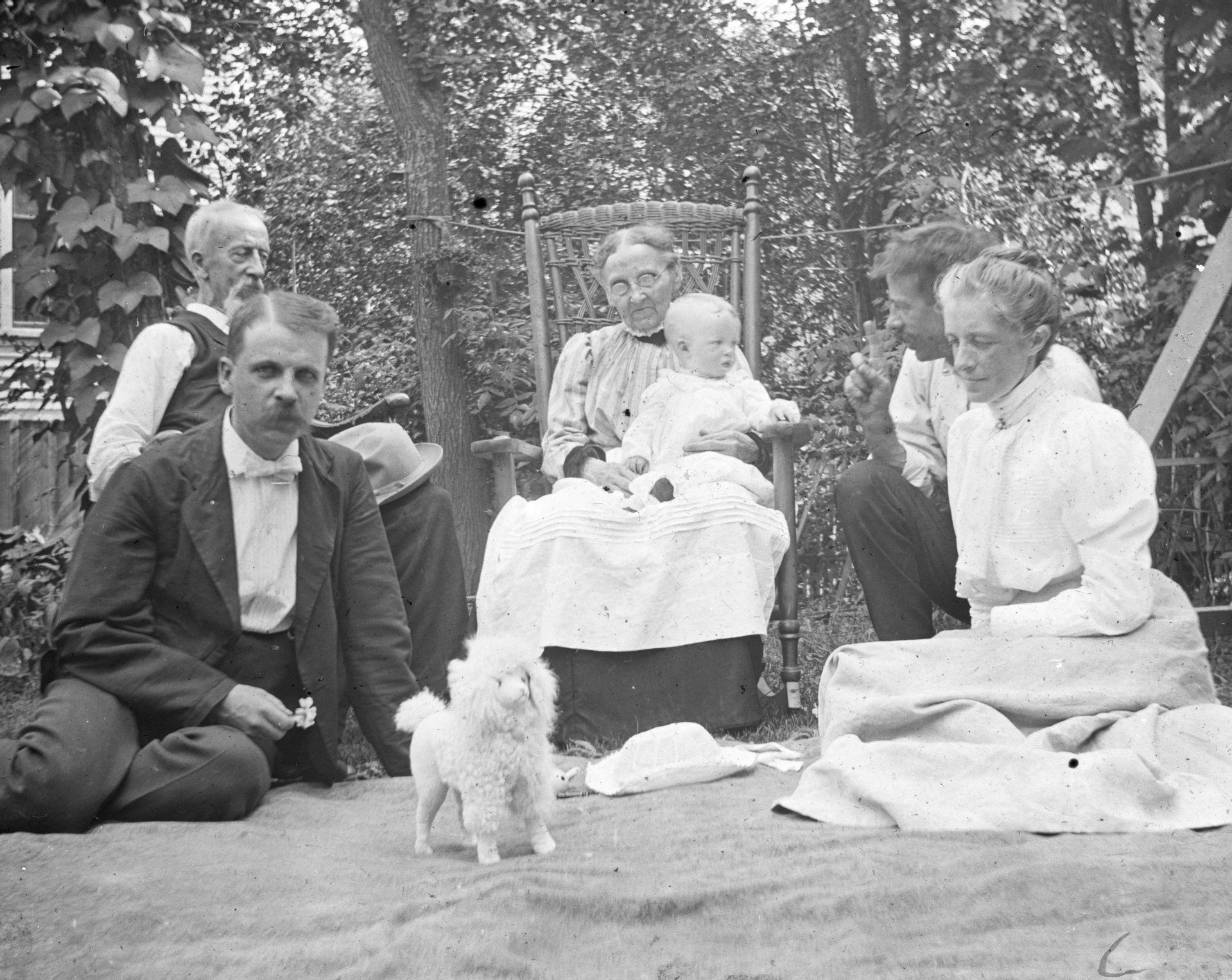 Glass lantern slide of the Moody Family. From left to right: Samuel F. Moody (1833-1906) (back), Frederick S. Moody (1867-1941) (front), Mary E. Spencer Moody (1833-1914), Charles F. Moody (1901-1960), Charles E. Moody (1859-1915), and Emma Wight Moody (1861-1943). "Home Folks" is written on the label on the slide. According to the 1900 census, Samuel, Mary, Frederick and Emma were all living at 12 Cutts Avenue (32 Cutts today) in Saco, just before Charles F. was born. Charles E. Moody was likely visiting as he was still living in Newark at this time. The dog is actually a stuffed toy and appears in other photos with Charles F.
