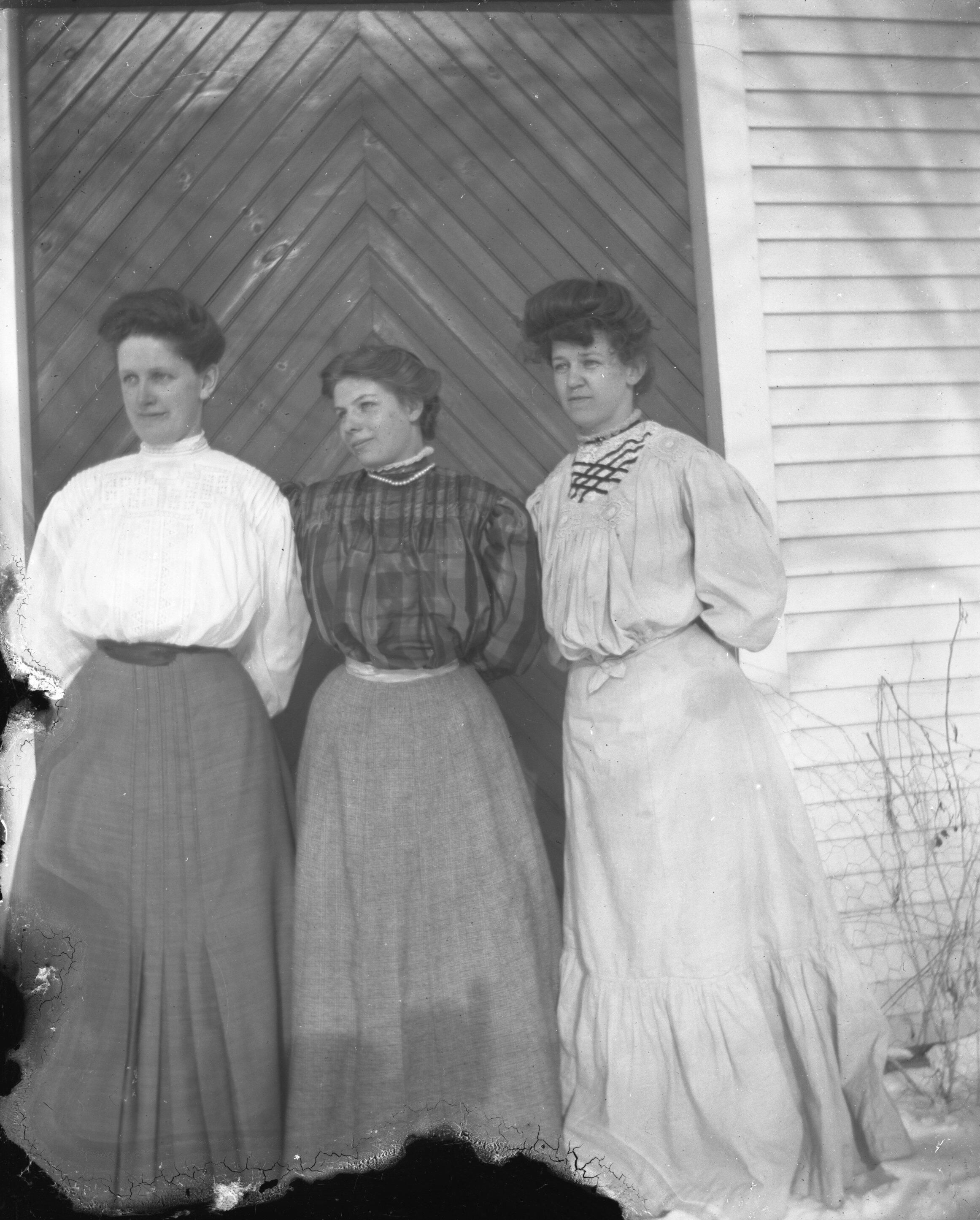 Glass plate negative photo of (left to right) two unidentified women and Eunice Amanda Hobbs Staples, circa 1909.