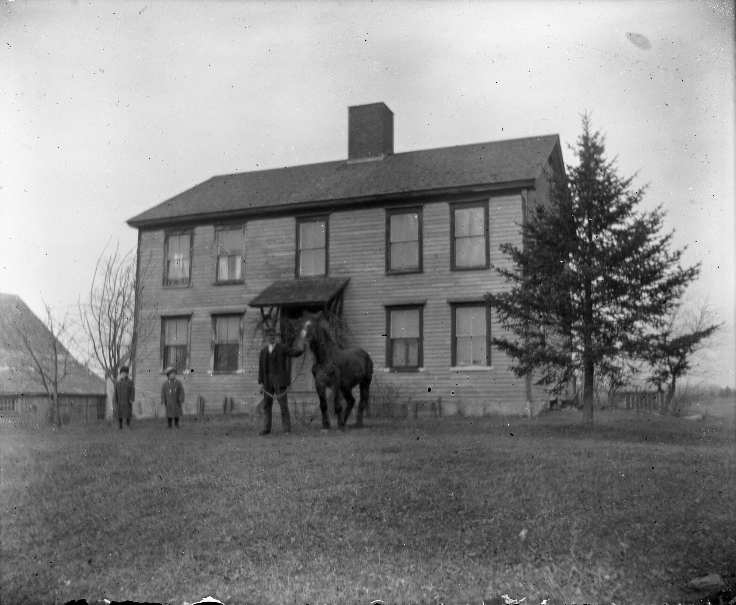Glass plate negative photo of Rufus Milton Hobbs (1877-1940), his sons Raymond Milton Hobbs (1906-1940) and Elmer Lesco Hobbs (1909-1979) and his horse in front of 79 Watson Mill Rd., Saco, ME.
