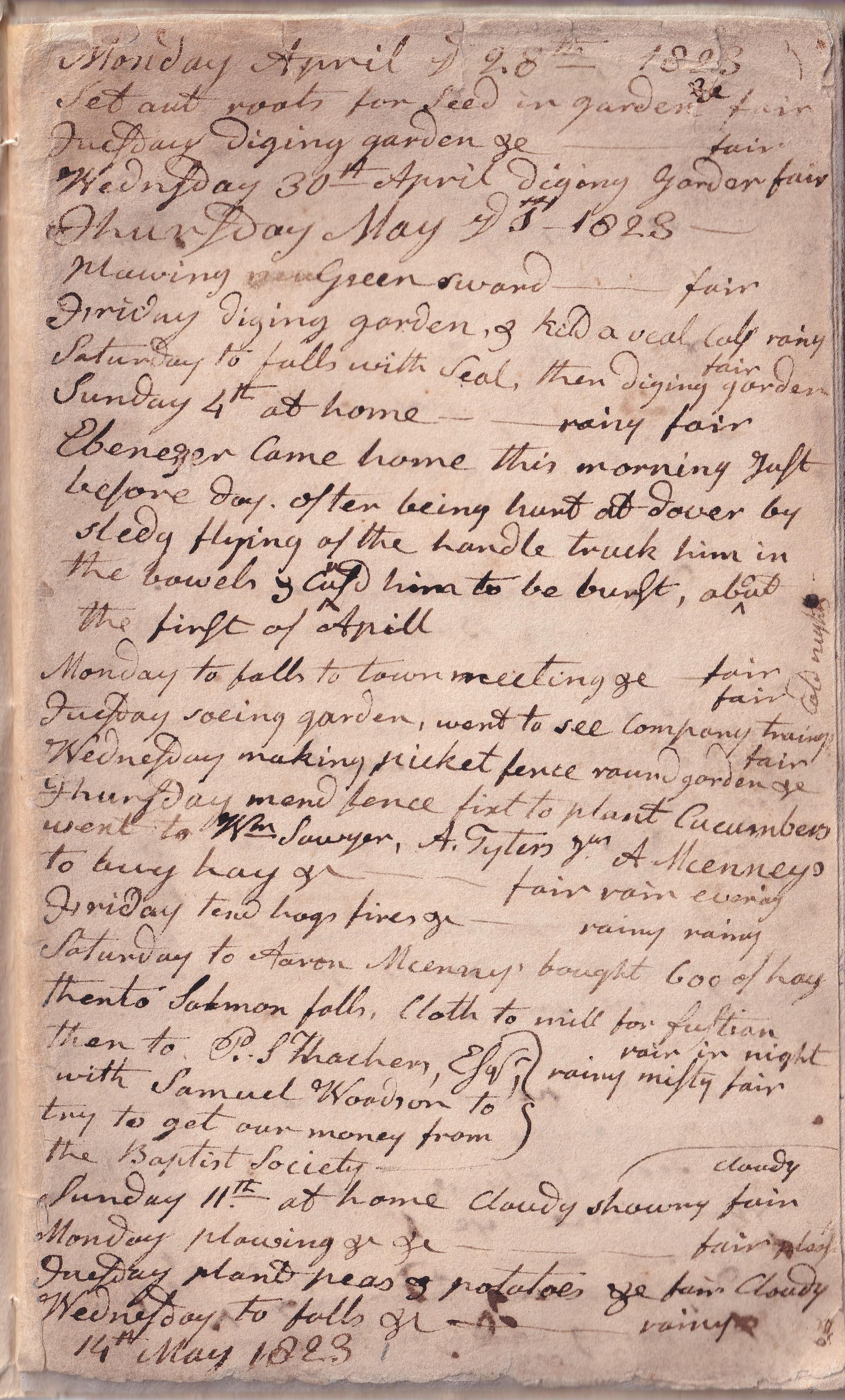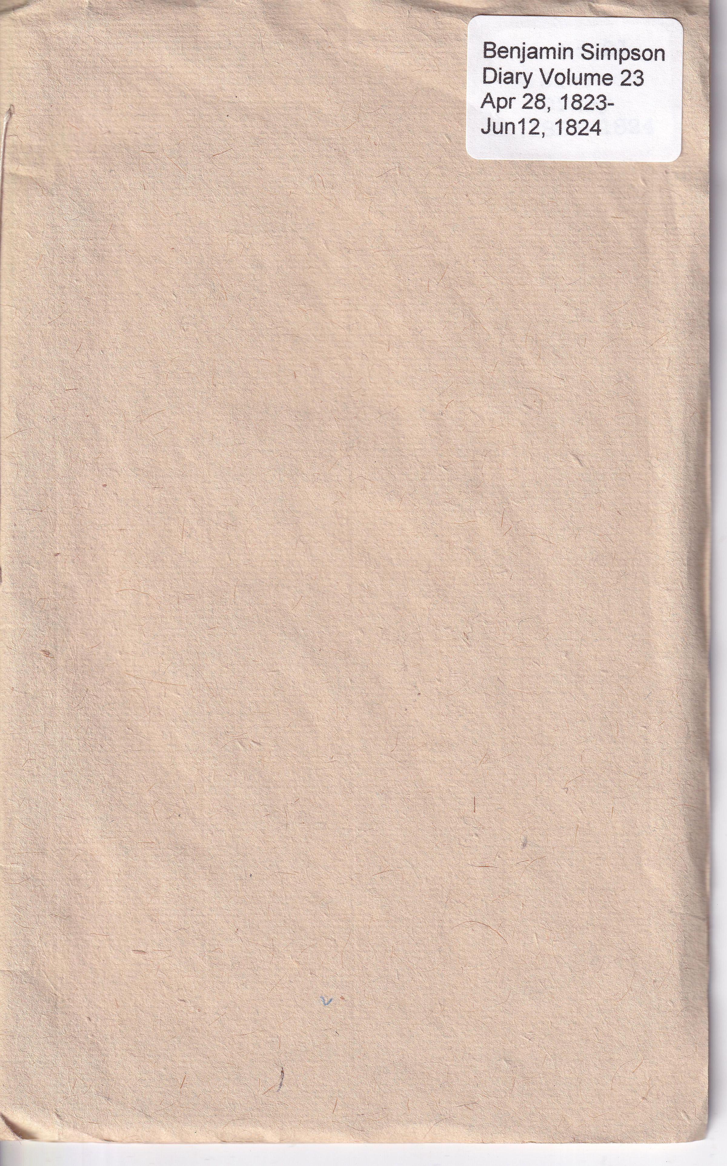 Twenty-third volume of the diary of Benjamin Simpson of Saco, 1781-1849. This volume covers the period April 28, 1823 through June 12, 1824. It is handwritten in ink on rag paper with a handsewn binding; it is now housed in a modern paper cover. Most of the entries are a single line. The date is listed at the top of each page, with individual entries (without dates) listed below. Simpson noted his major task of the day and the weather.