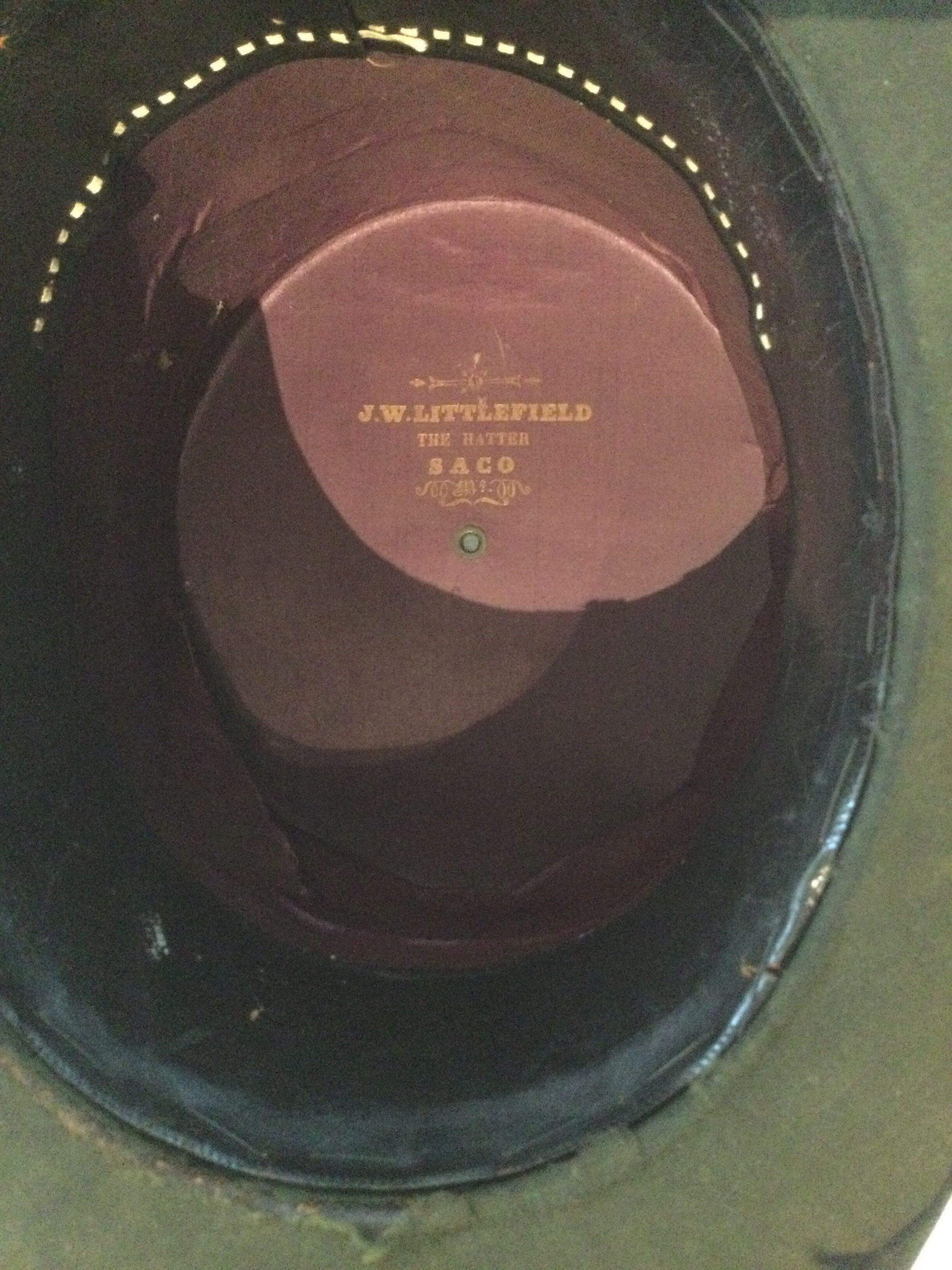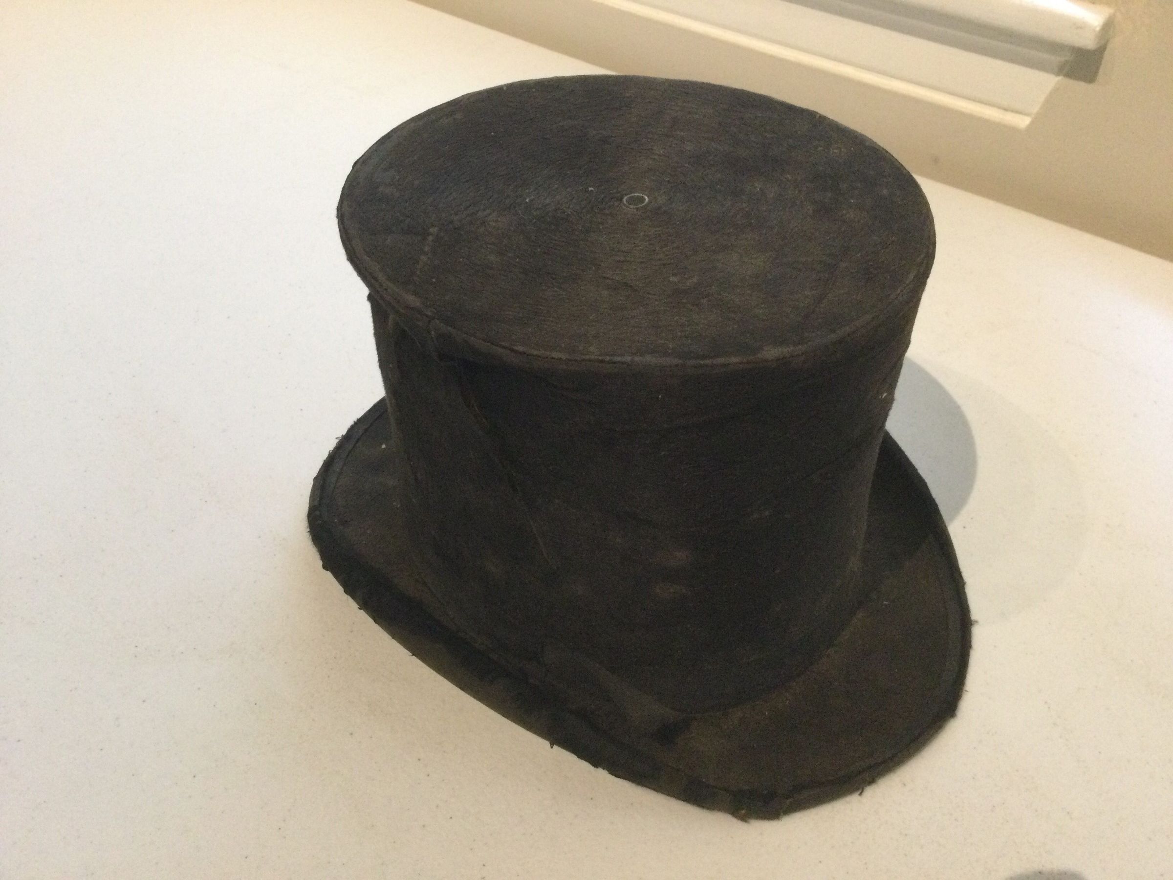 Man's top hat. Black silk plush outer covering trimmed with black grosgrain ribbon at bottom of crown where it joins the brim and flat bow on the wearer's left side, slightly curved two-inch brim also edged with black grosgrain. There is a small round mesh vent in top of crown. The interior is lined with a thin purple silk (?) with the retailer's mark printed in gold along with a possible maker's mark and decorative elements. A brown leather band, with a narrow woven tape to serve as an adjustment is sewn to the inside bottom of the crown with large stitches. This band may be a replacement. The underside of the brim is lined with a finely woven wool which may have been black but is now an olive green.Made/Created