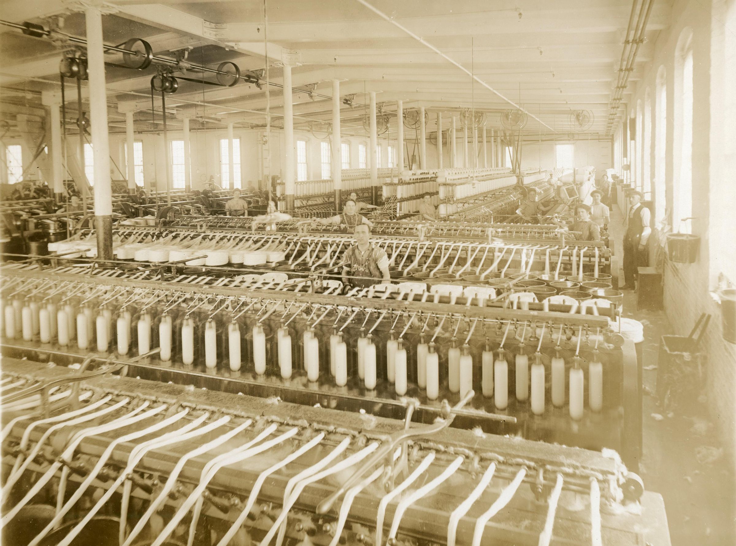 Photograph of workers at slubbing machines in the Laconia Division of the Pepperell Manufacturing Company.