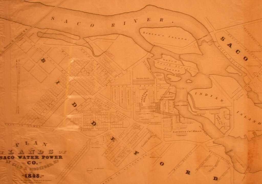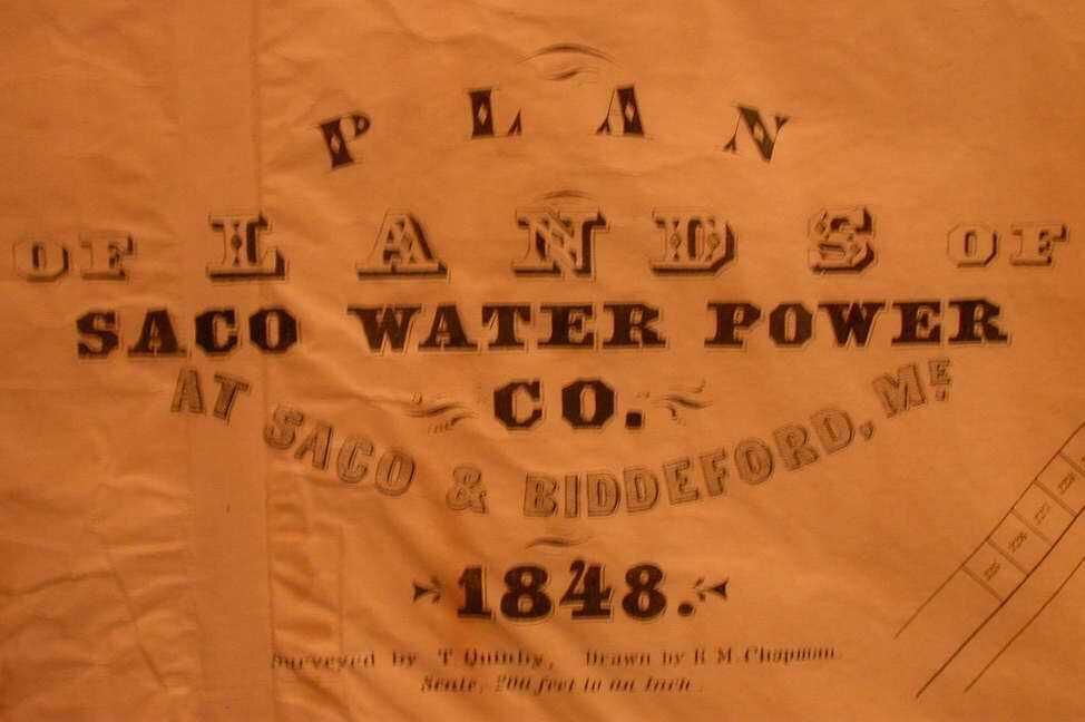 PLAN OF LANDS OF SACO WATER POWER CO. AT SACO & BIDDEFORD, ME 1848" depicting the Saco River across the top and on the right side with Saco on the upper right and the rest of the plan devoted to Biddeford. Includes the various mills, canals, streets, boarding houses, churches, hotels, banks, etc.Dimensions