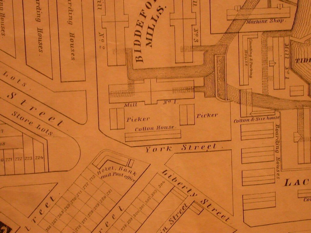 This plan notes the locations of the existing York and Laconia Mills, as well as the Pepperell Mills, under construction at the time and designated as “Biddeford Mills.” The waterways from the river to the Biddeford Mill buildings are the underground canals that provided power to the mill complex. The plan also shows a variety of support buildings, including picker houses, machine shops, and boarding houses.