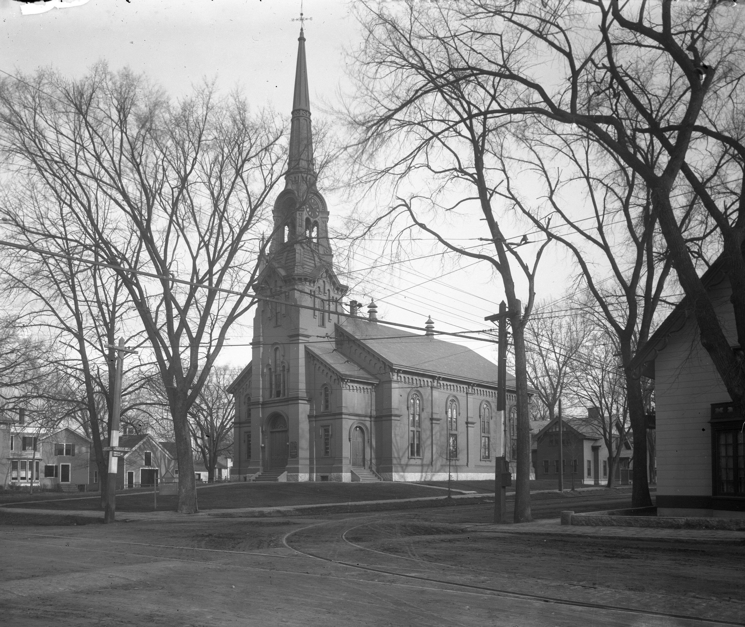 Glass plate negative photo of First Parish Congregational Church, Saco, ME. This is the second version of the church built in 1862 by architect John Stevens. The first version, built in 1803 by Bradbury Johnson, burned down in 1860. This second version, which stood as a prominent landmark in Saco for 138 years, burned down in 2000.Made/Created