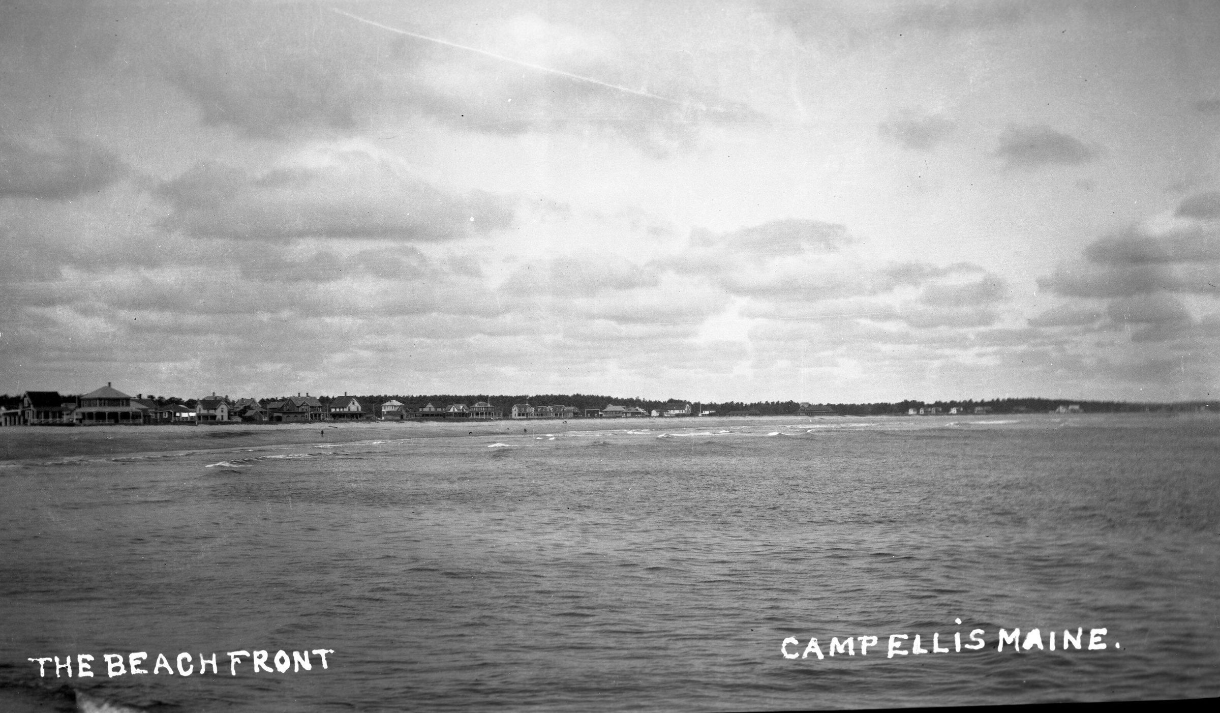 Negative print photo of Camp Ellis, ME. View taken from the ocean. "The Beach Front" is inscribed on the photo.Made/Created