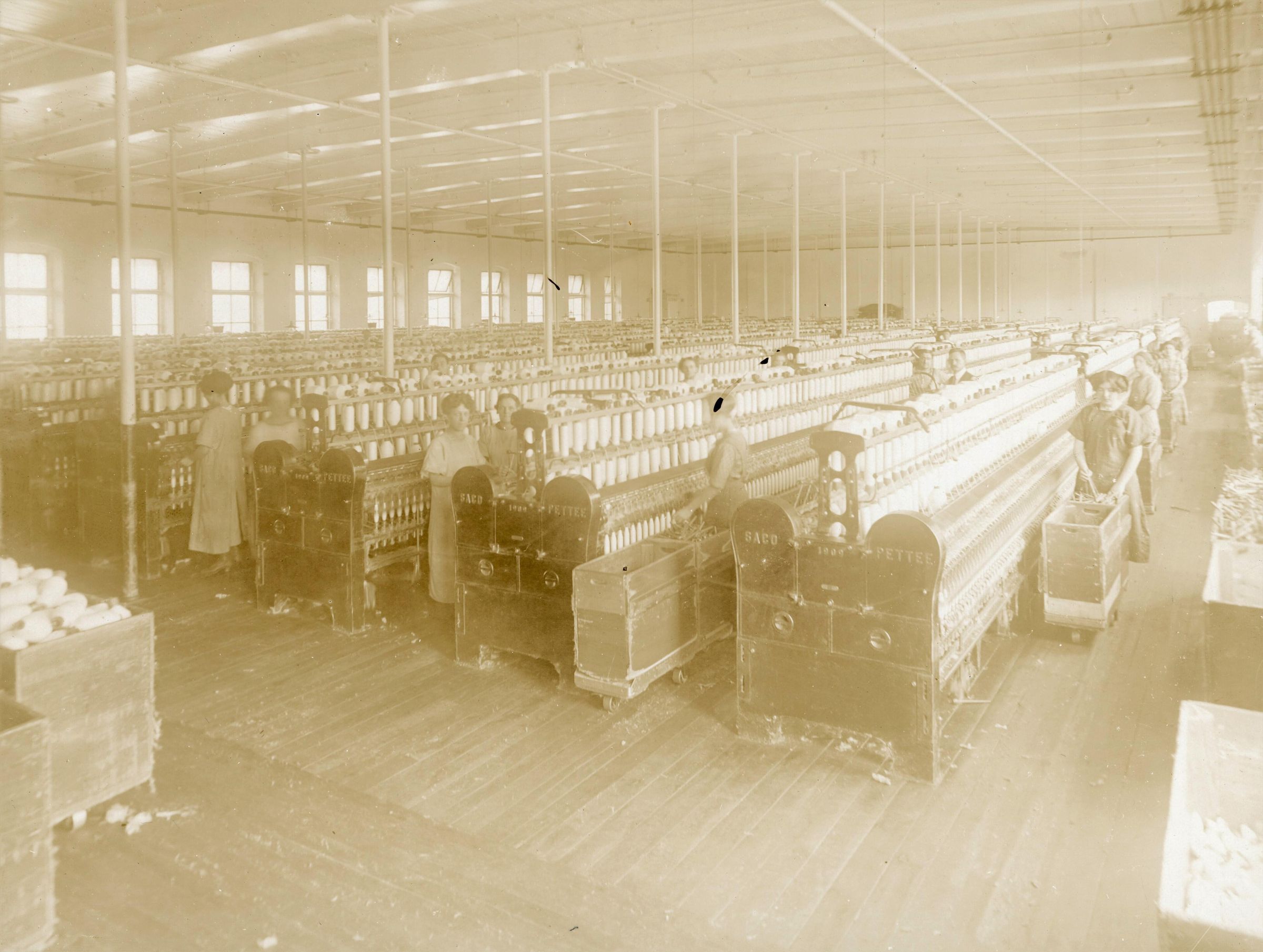 Photograph of workers in a spinning room in the Laconia Division of the Pepperell Manufacturing Company.