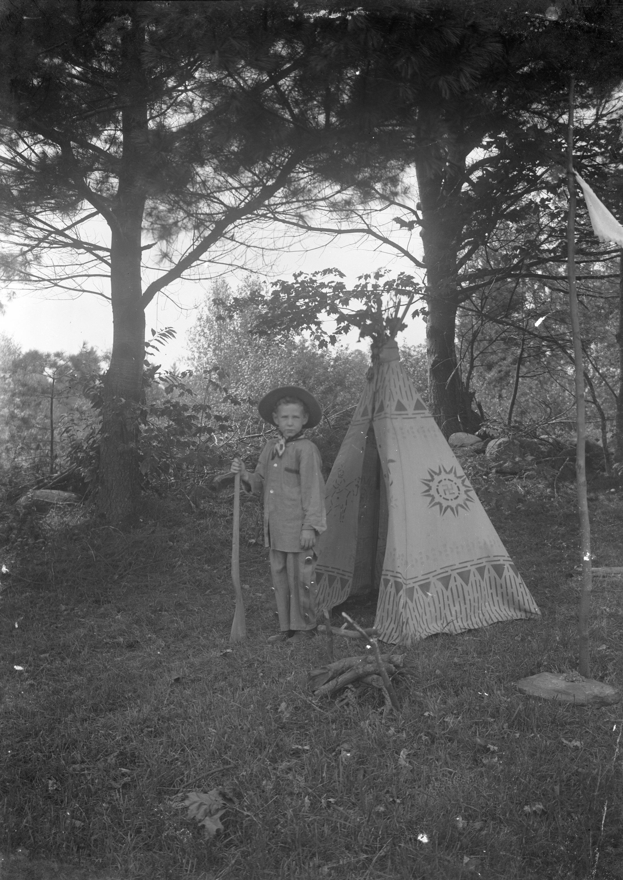 Glass plate negative photo of an unidentified boy dressed as a ranger. (The same boy appears in 1993.21.377, .388, .395, .398, .407, .424, .426, .431, .432, .433 and .440)Made/Created