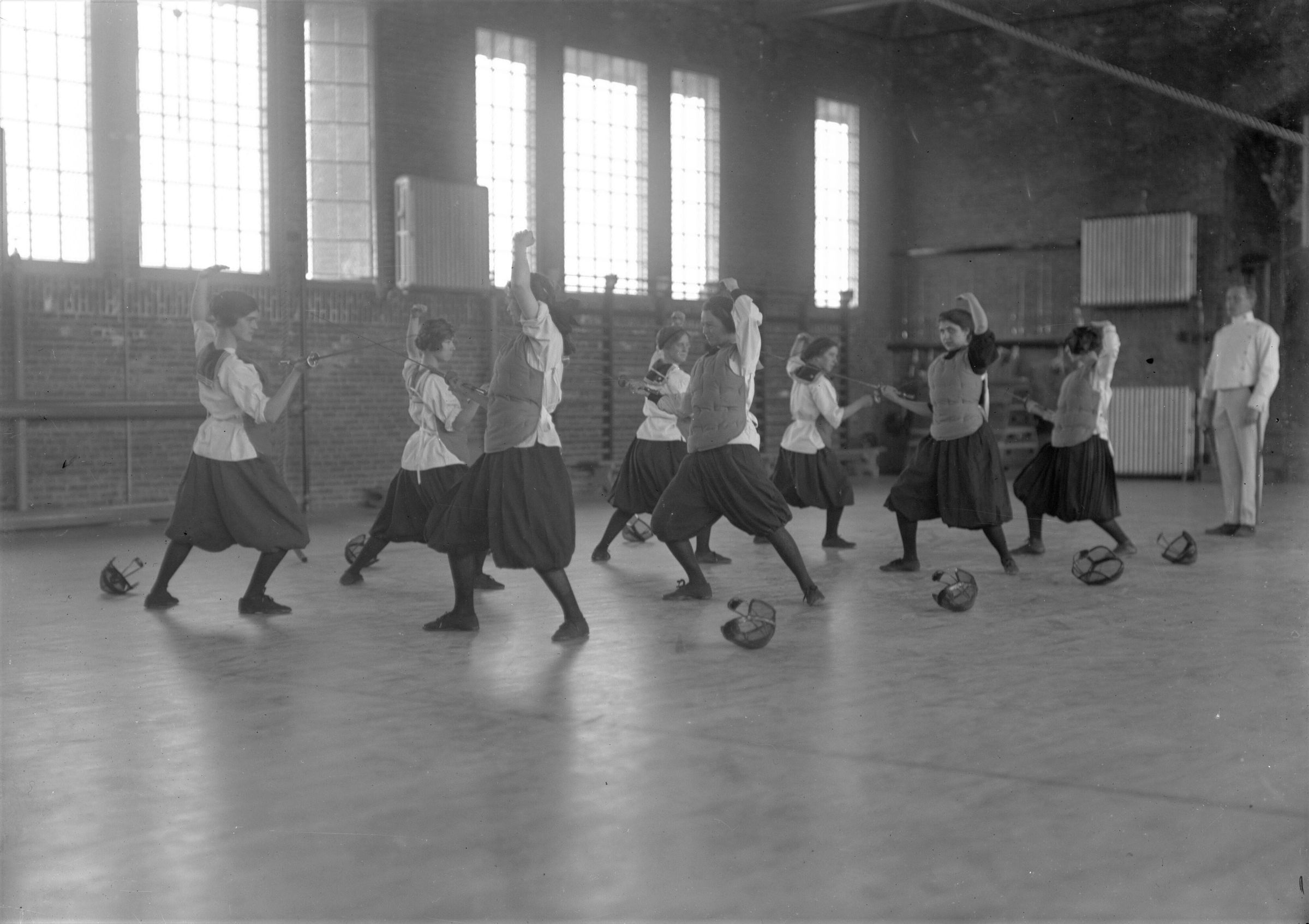 Glass plate negative photo of a group of girls and a male coach in fencing class at Thornton Academy. This is in the original George Addison Emery Gymnasium which was built in 1913. Today the building houses the school library.