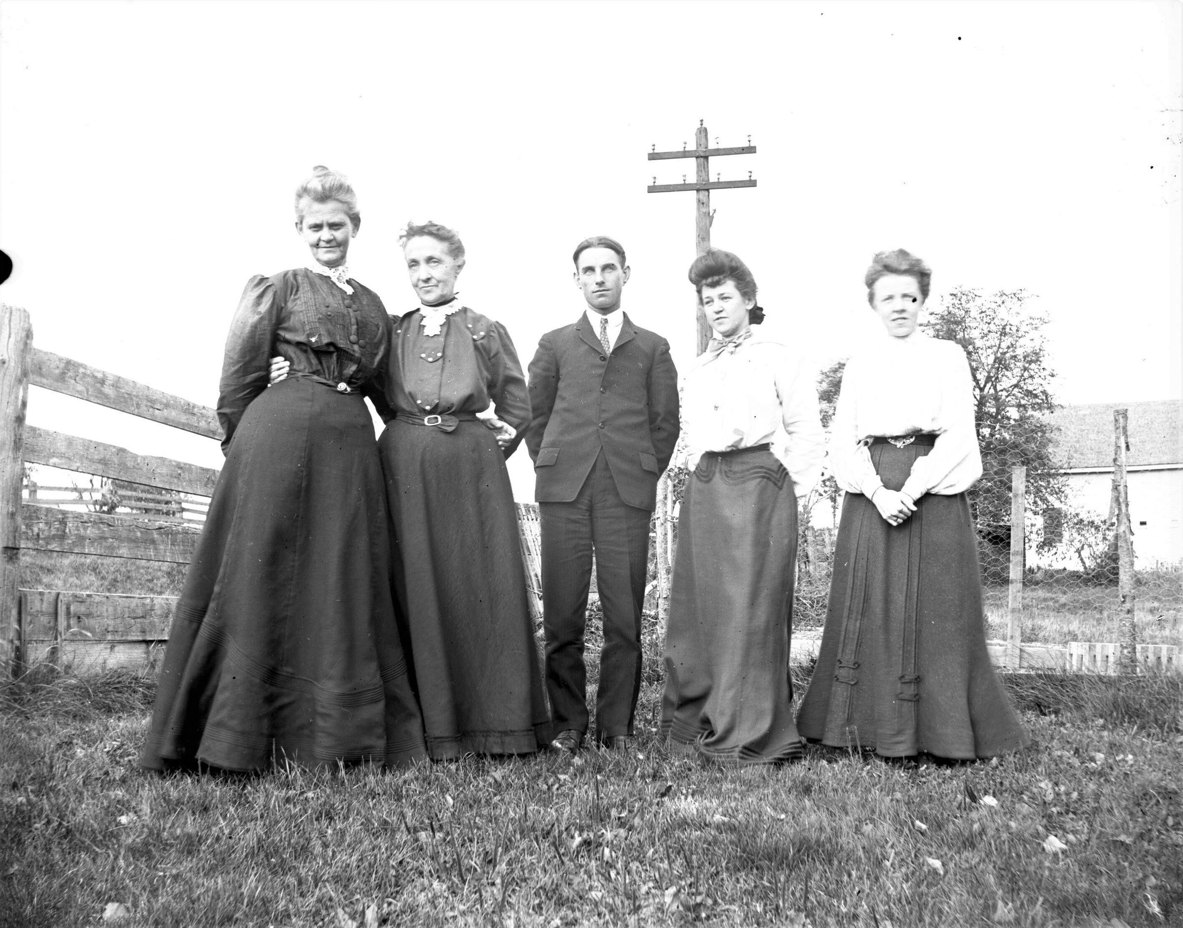 Glass plate negative photo of the Hobbs family. From left-to-right: Sarah Lane Hobbs (Aug. 16, 1848 - July 2, 1935), unidentified woman, unidentified man, Eunice Amanda Hobbs (Jan. 27, 1883 - May 23, 1955), unidentified woman. Taken about 1907.