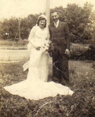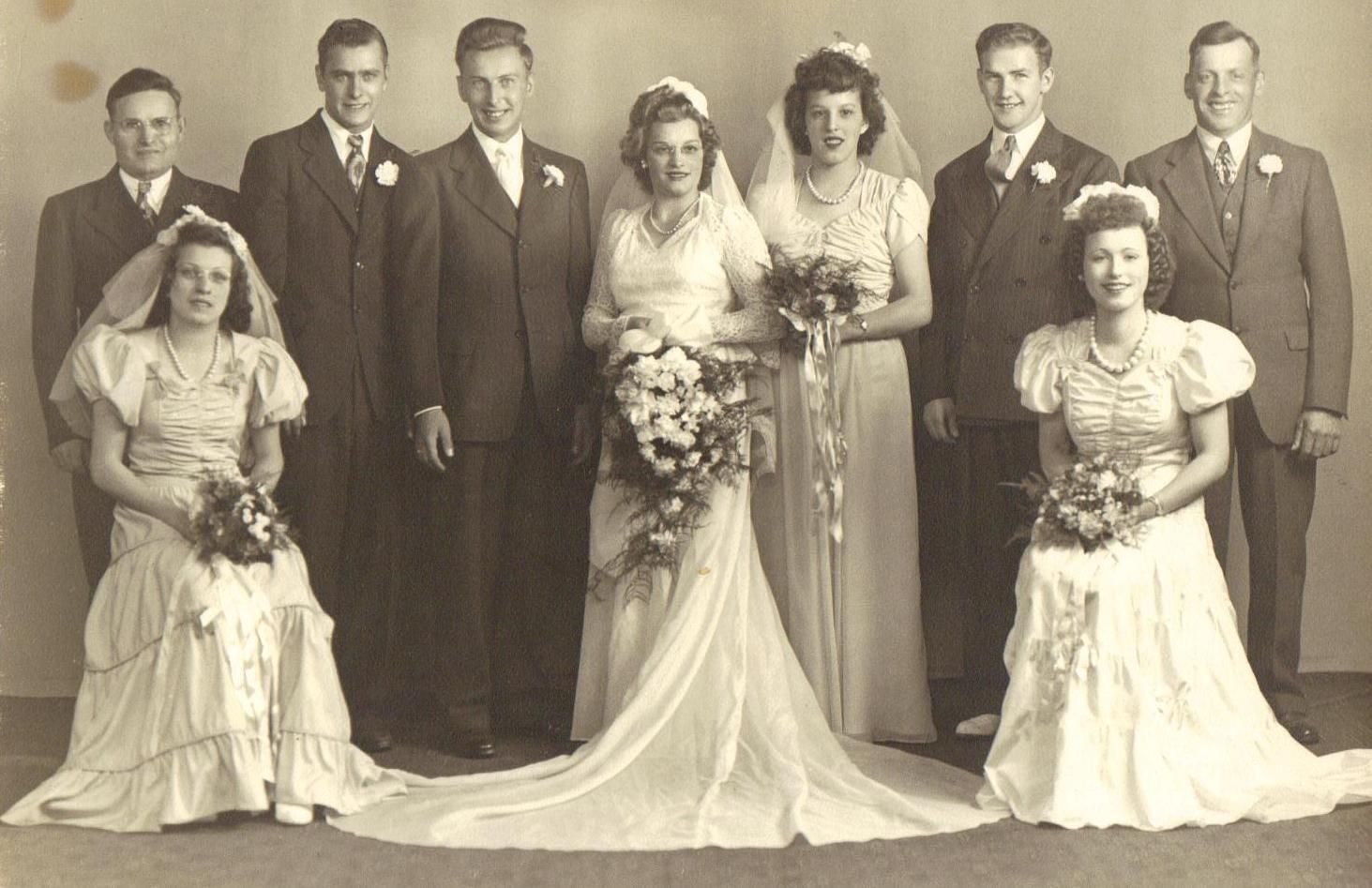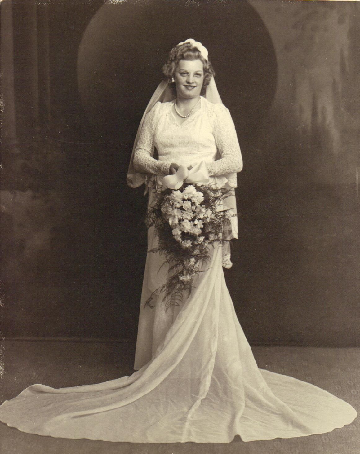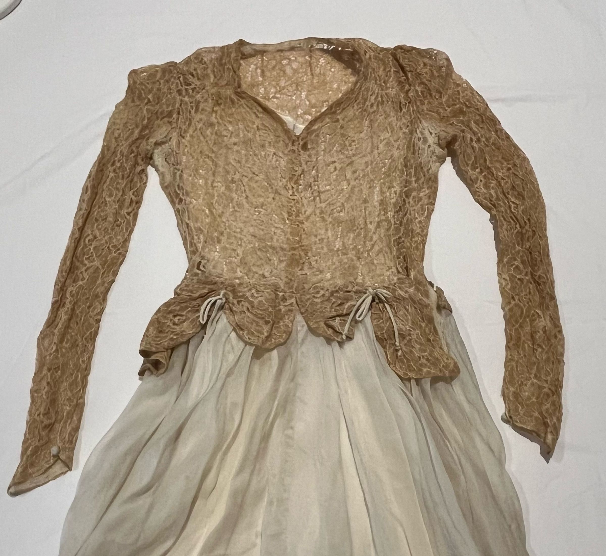 Wedding dress with a lace top, now a beige color, V neck, long wrist-length sleeves with pointed ends and a single button closure. Side button entry. Peplum hem with the bottom drawn up into three curved sections with white cord bows. White organza skirt with cathedral train; two loops for a bustle. Narrow hem on skirt and train. Worn over a white synthetic underdress, sleeveless with white spaghetti straps.