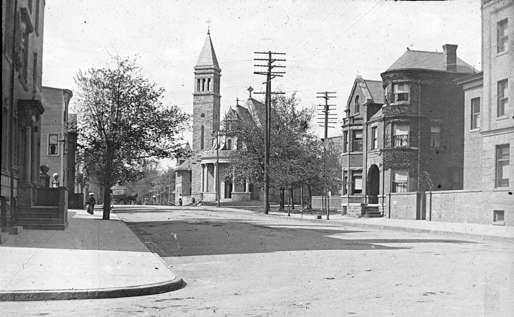 Glass lantern slide of the St. Columba's Catholic Church in Newark, NJ. "St. Columbus [sic.] Church - Penn Ave from South Park" is written on the label on the slide.