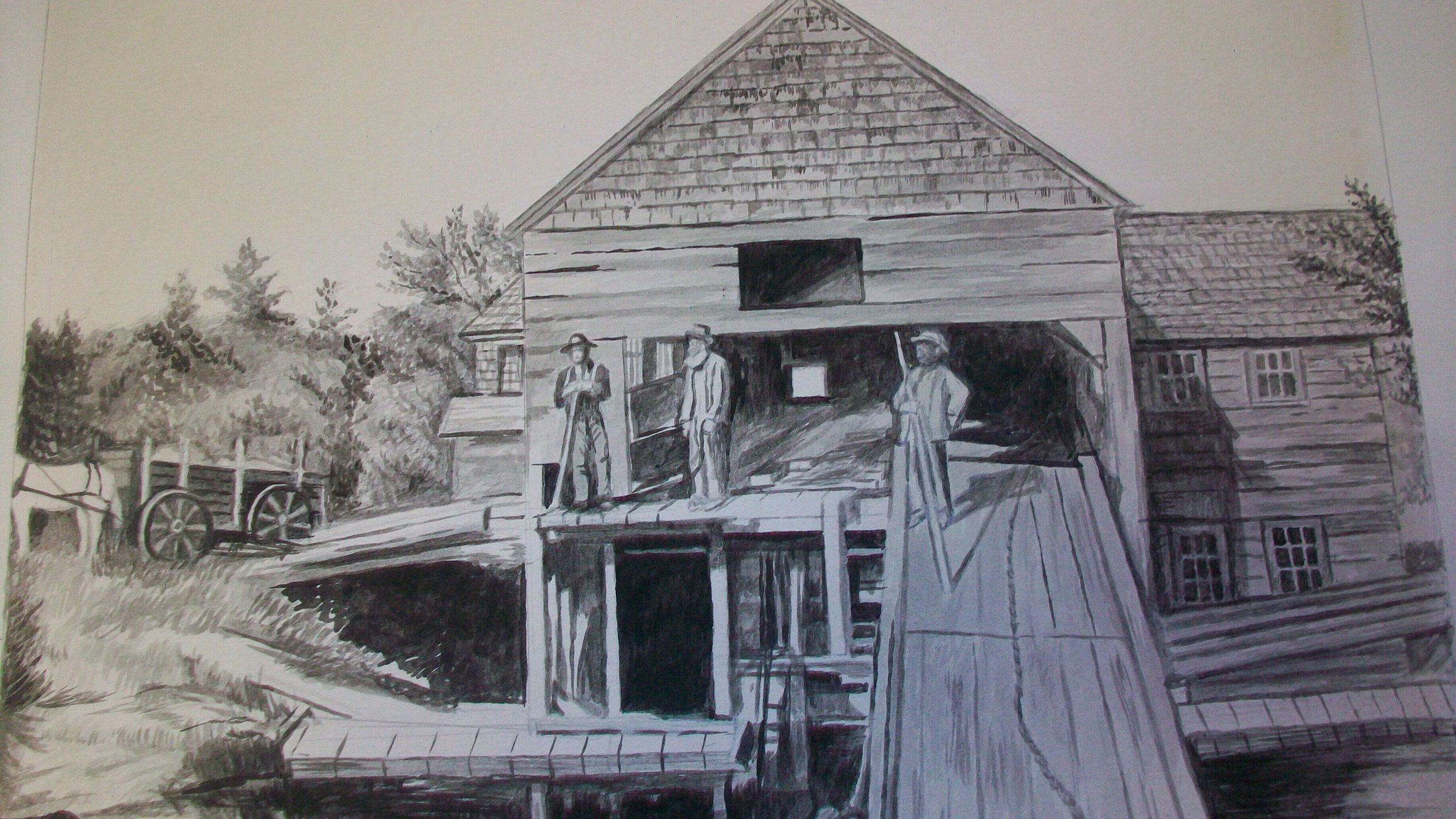 Watercolor painting of the Thurston Mill by Elmer Hobbs who lived near the site of the mill, which was located at the junction of the Watson Mill Road and the Nonesuch River in Saco,Me.