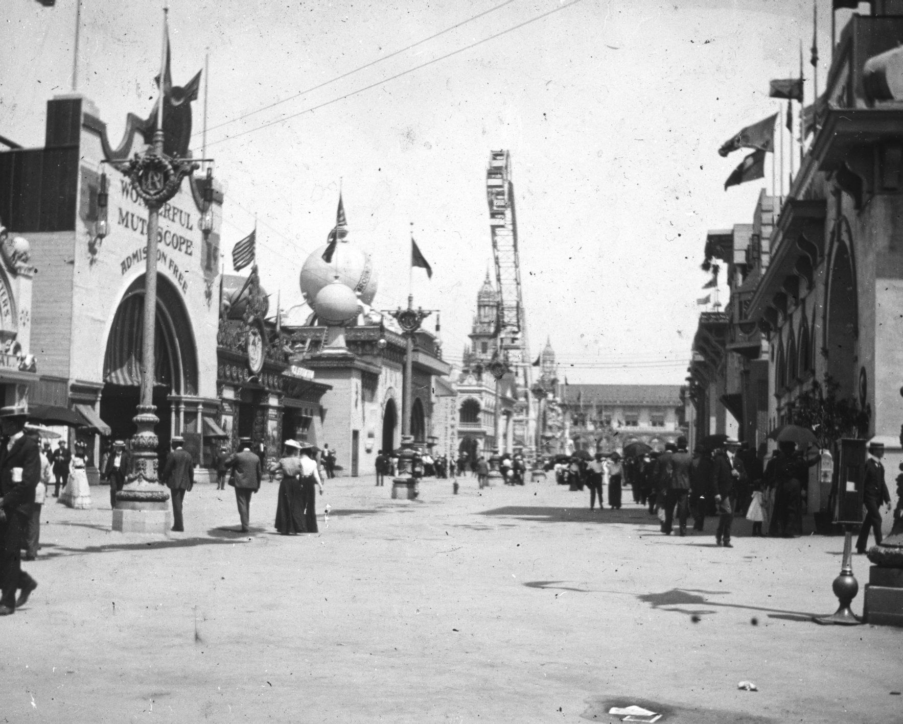 Glass lantern slide of the Pan American Exposition in Buffalo, New York in 1901. "The Pan-American. The 'Midway' See-saw" is written in the label on the plate.