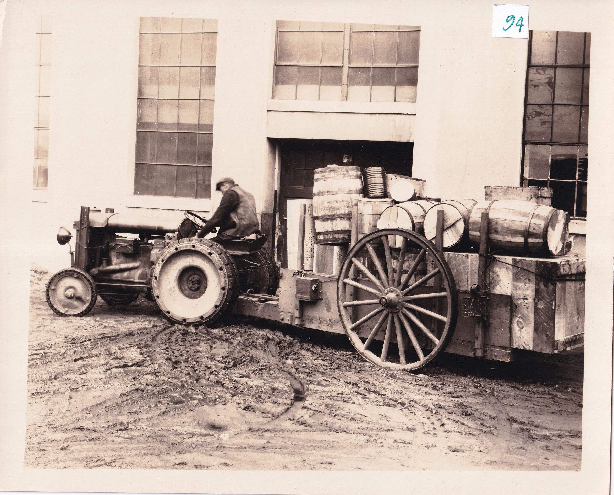 Saco-Lowell Shops foundry yard wagon. A man is driving a small tractor with a trailer stacked with wooden barrels.Made/Created