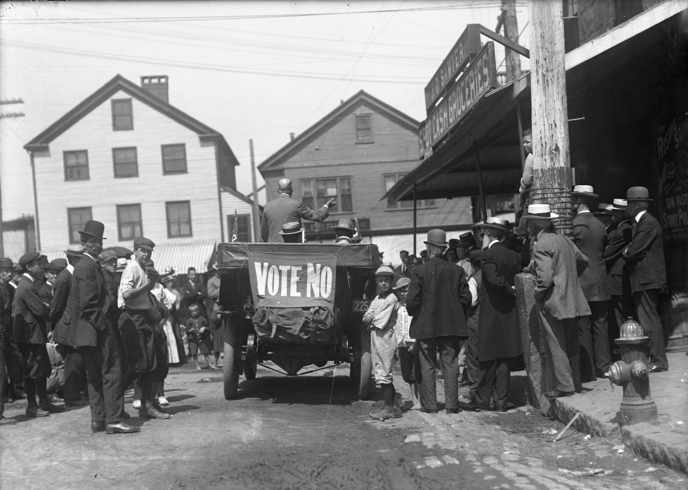 Glass plate negative photo of a political rally at John Q. Sawyer's (1841-1916) grocery store at 1 Pepperell Square, Saco, ME. Possibly 1912 temperance movement rally.
