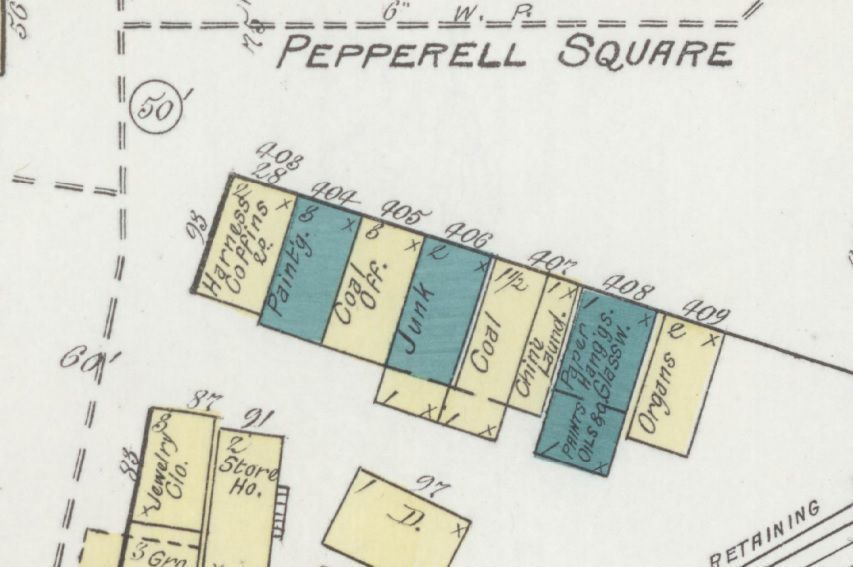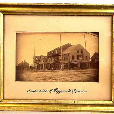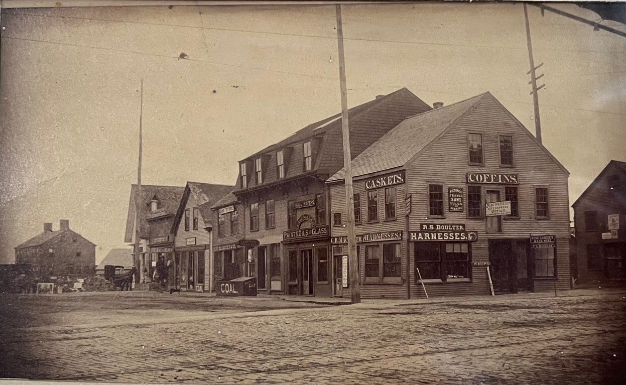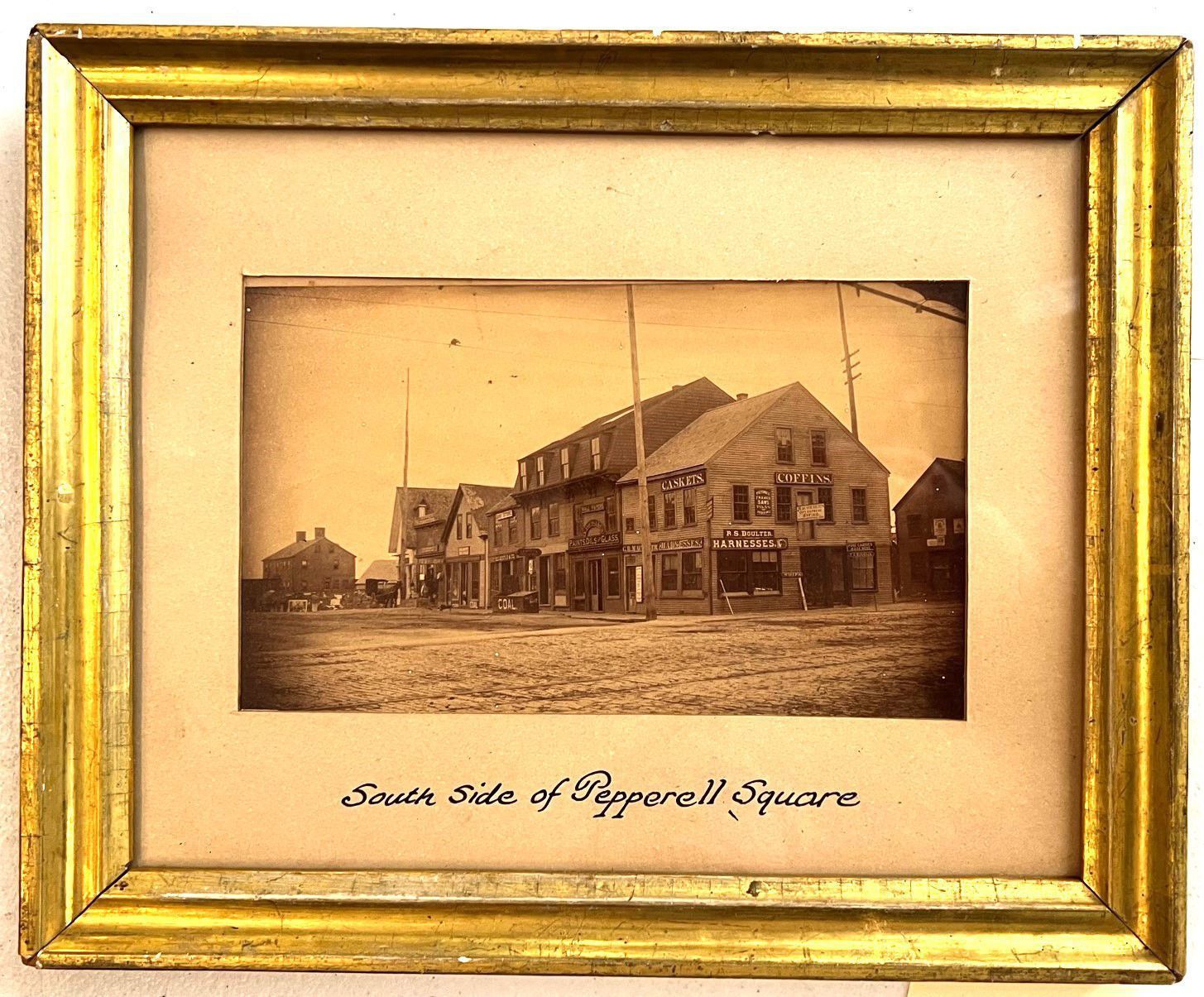 A framed photograph of the "South Side of Pepperell Square." Circa 1880s. Several business signs can be seen, inlcuding "Caskets, "Coffins," R.S. Boulter Harnesses," "Painted Oils & Glass," "Coal" and "Laundry." The businesses correspond with the 1891 Sanborn Fire Insurance Map of Saco, Maine. The laundry business is listed as a "Chinese Laundry" in the map. According to the Biddeford & Saco Directory of 1890-91, Long Hop (in later directories as Hop Long) ran a laundry business at 23 1/2 Pepperell Square. He was a well known character in Saco - there are several newspaper articles about him during the 1880s/1890s.