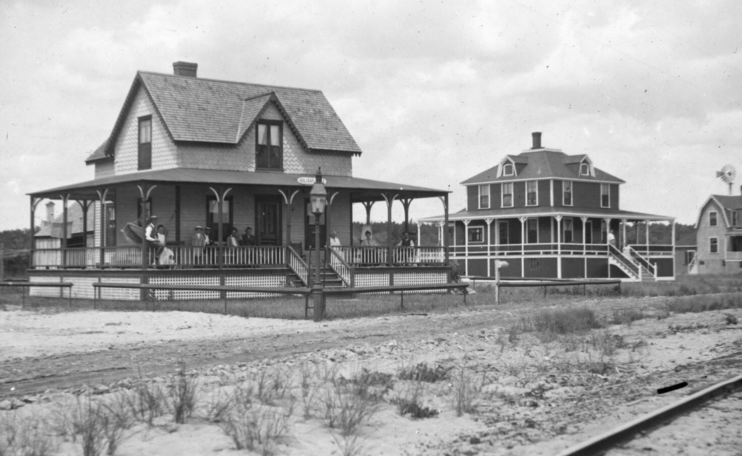 Glass lantern slide photograph of summer cottages at Camp Ellis, ME. The train tracks for the Dummy Railroad are partially visible in the foreground. The "Holiday Home" cottage is on the left (same one that appears in 2010.46.35). A catalog note on the sleeve of the 2010.46.35 plate calls this the "G.H. Emerson" cottage, but this has not been verified.