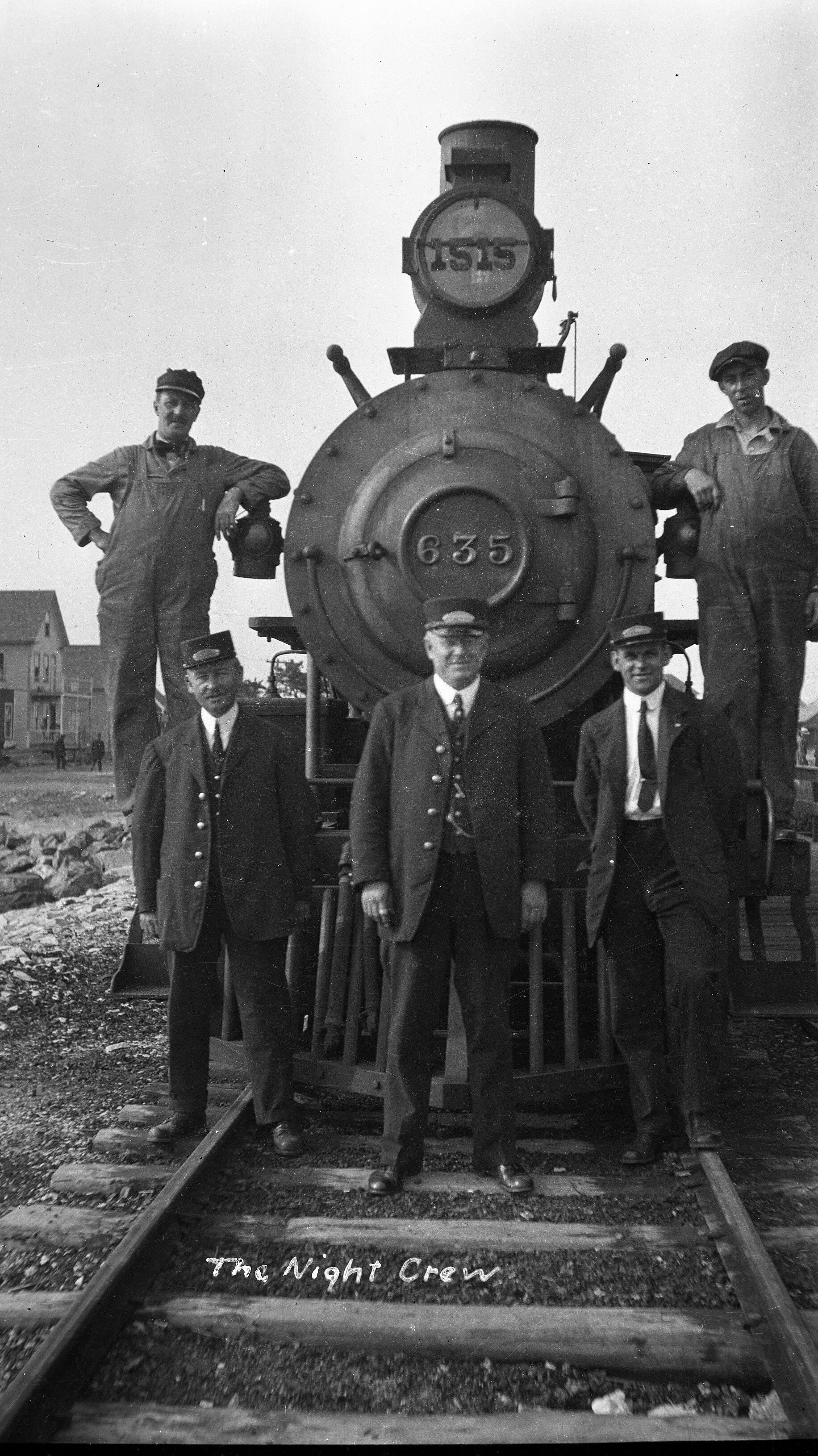 Negative print photo of a railway crew for the Dummy Train that ran along Saco Bay, from Pine Point to Camp Ellis. "The Night Crew" is inscribed on the print negative.Made/Created