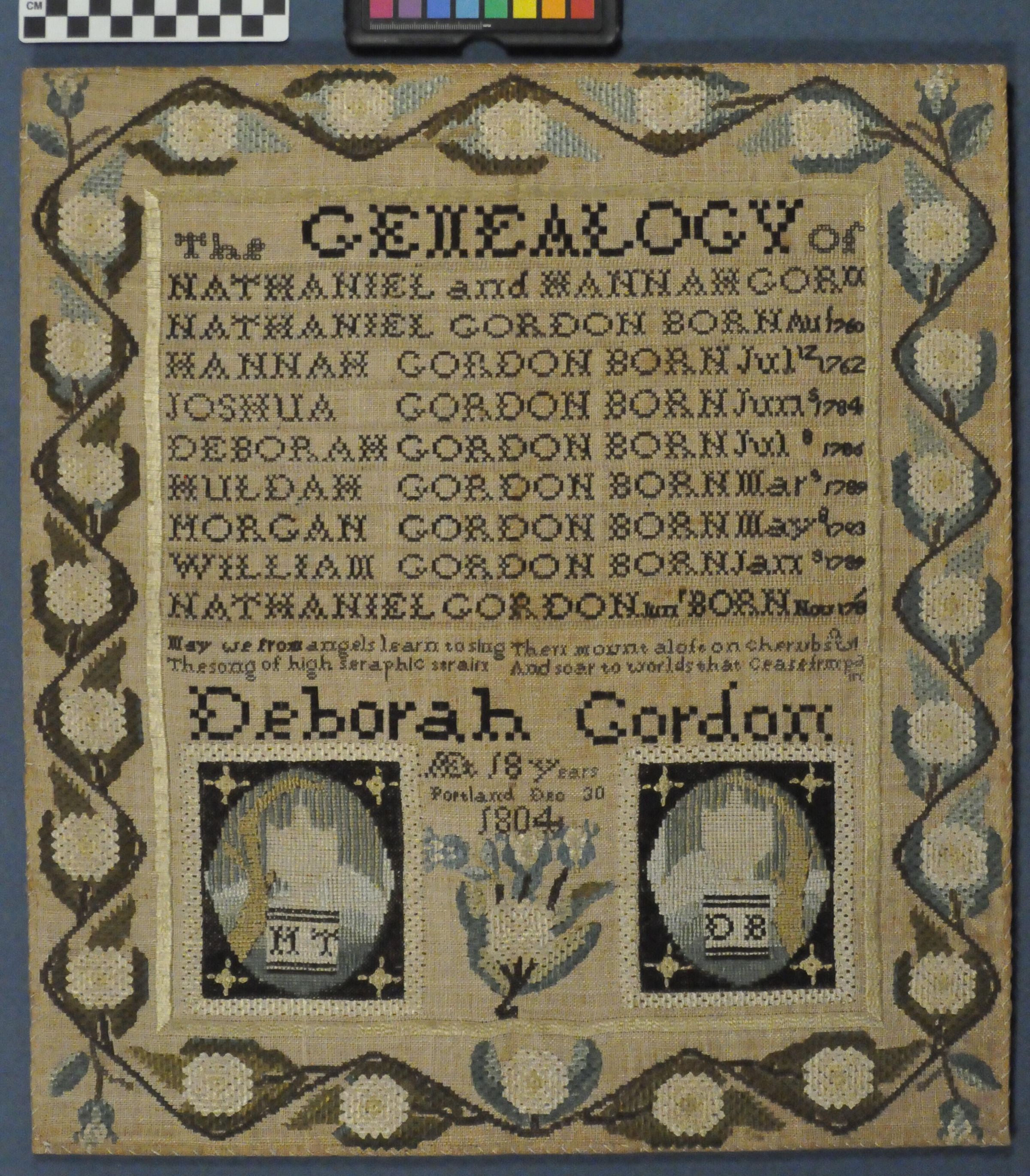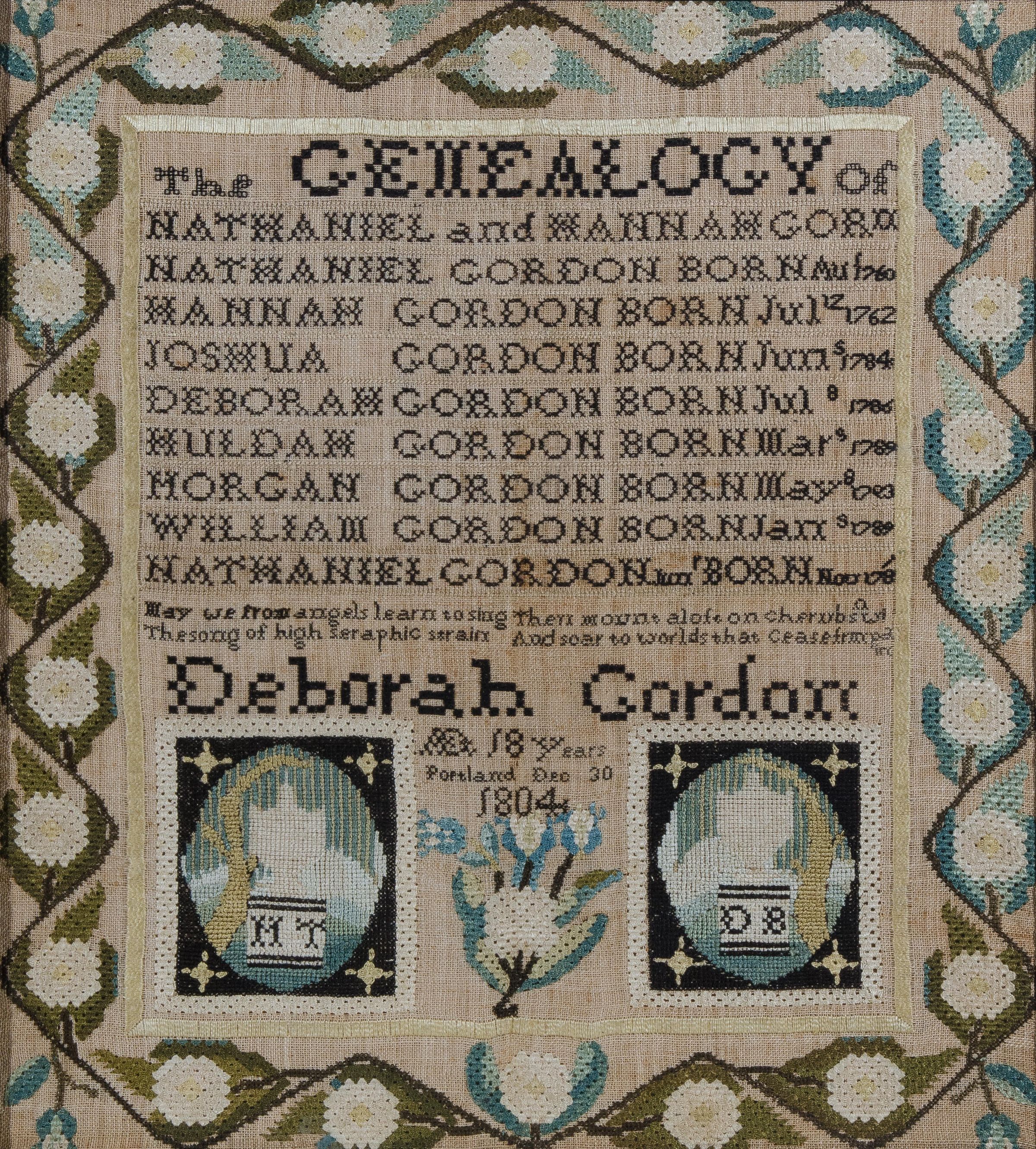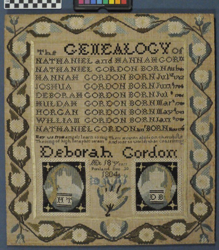 Deborah Gordon’s genealogical sampler currently represents the earliest known one from a rather large group of Portland-made work. Deborah was the daughter of Hannah Fisher and Nathaniel Gordon. In early 1810, Deborah married Peter Thacher of Gorham. Peter’s mother, Aphia Mayo, was Simeon Mayo’s sister and therefore also the aunt of the Misses Mayo, who later ran a Portland academy. On December 10, 1810, Deborah died; her husband died several months later. Deborah’s nieces Margaret, Susan, Huldah, and her namesake, Deborah Gordon, all daughters of her eldest brother, Joshua, attended the Misses Martin’s School for Young Ladies as day students.Label Type
