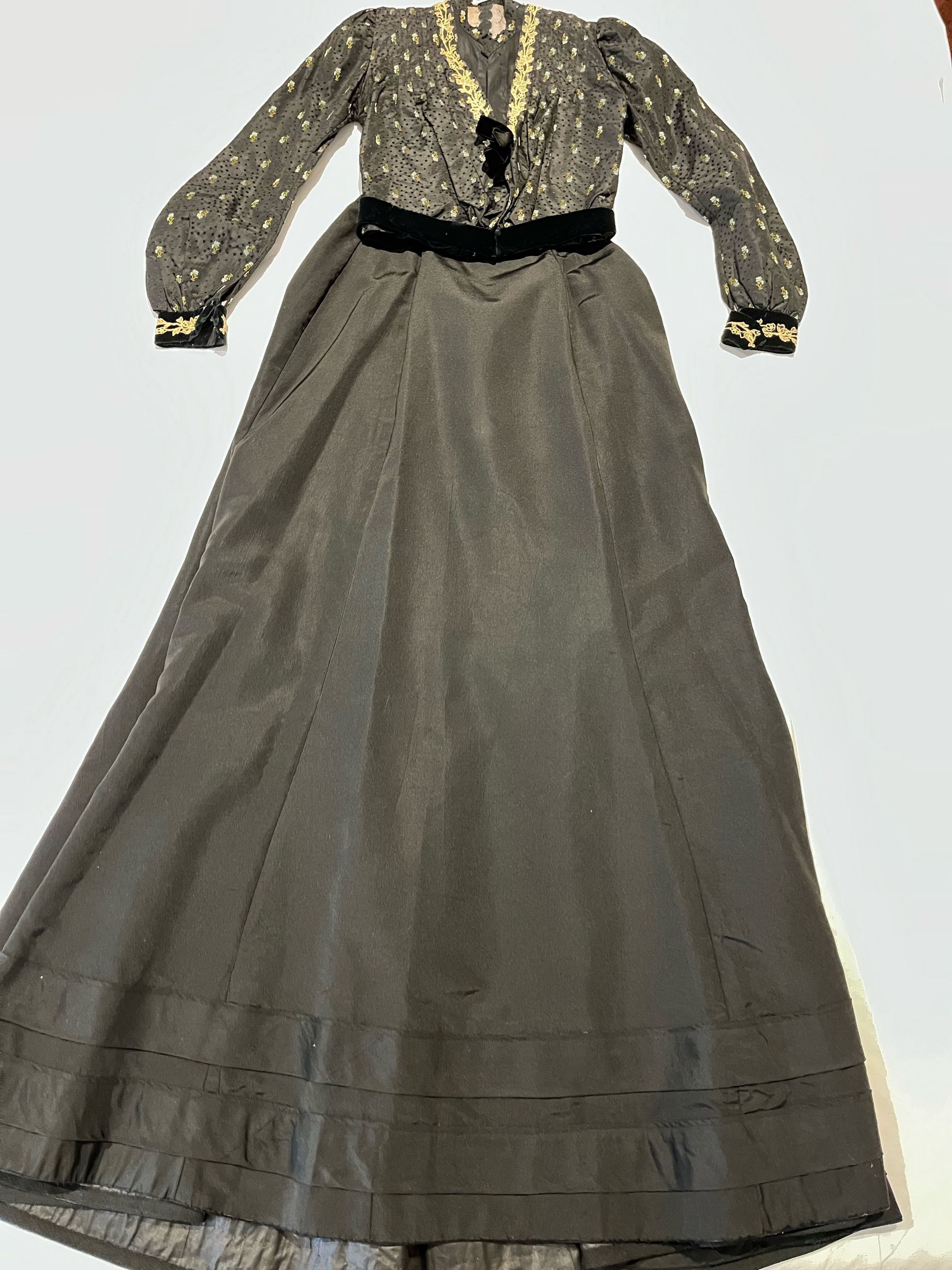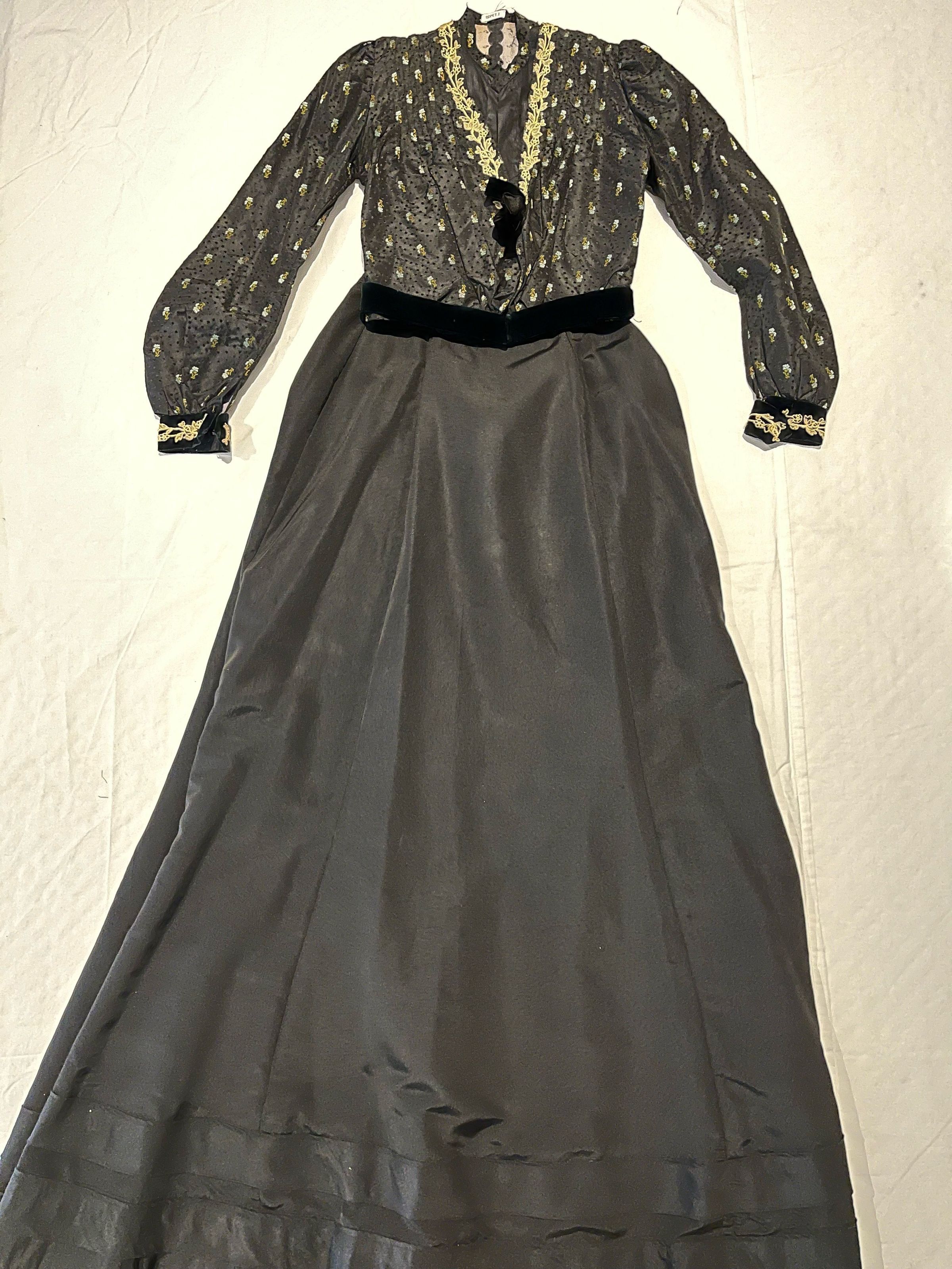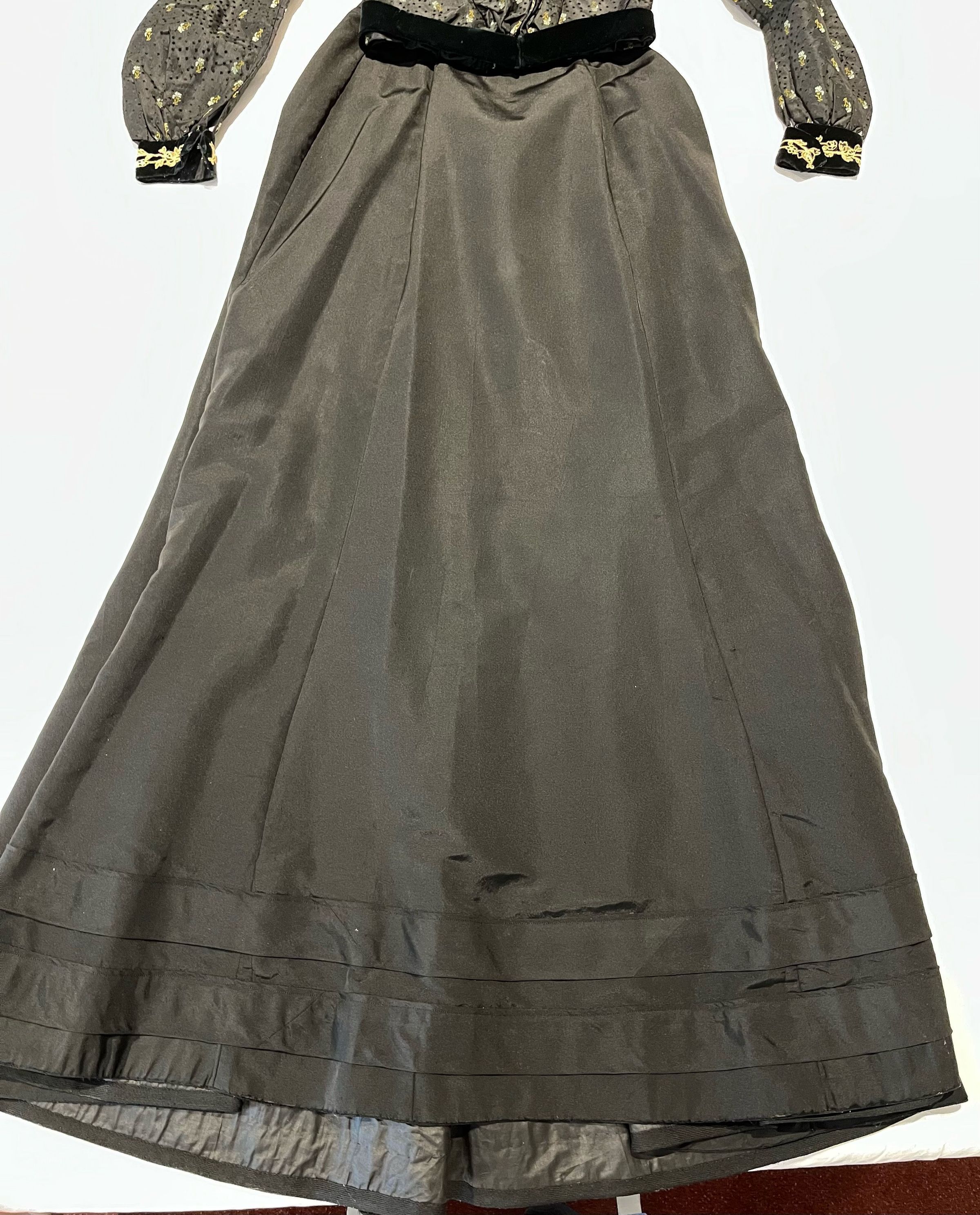 Bodice is of black silk brocaded with blue and green flowers trimmed with lace and black velvet. Short round standing collar of the same brocade sewn to the cotton lining. The bodice opens in the front with an interior black glazed cotton lining with hook and eye closures which is exposed at the top. The interior has no closures .The front of the bodice is pleated, with pleats sewn down at the shoulder and partway down the front. There is trailing floral patterned lace trim applied to the outside edge of the fashion fabric of the V-necked front with a black velvet bow at the bottom. Long sleeves are gathered at the shoulder and end in black velvet cuffs with the same floral lace applique. There is a black velvet bow at the waist; they are all secured with hooks and eyes. Black silk skirt with a short train. The front of the skirt is flat, fitted at the top and flaring out toward the bottom. There are two wide bands of the same fabric sewn above the hem. Lined with black glazed cotton. Closes at the back with hooks and eyes.