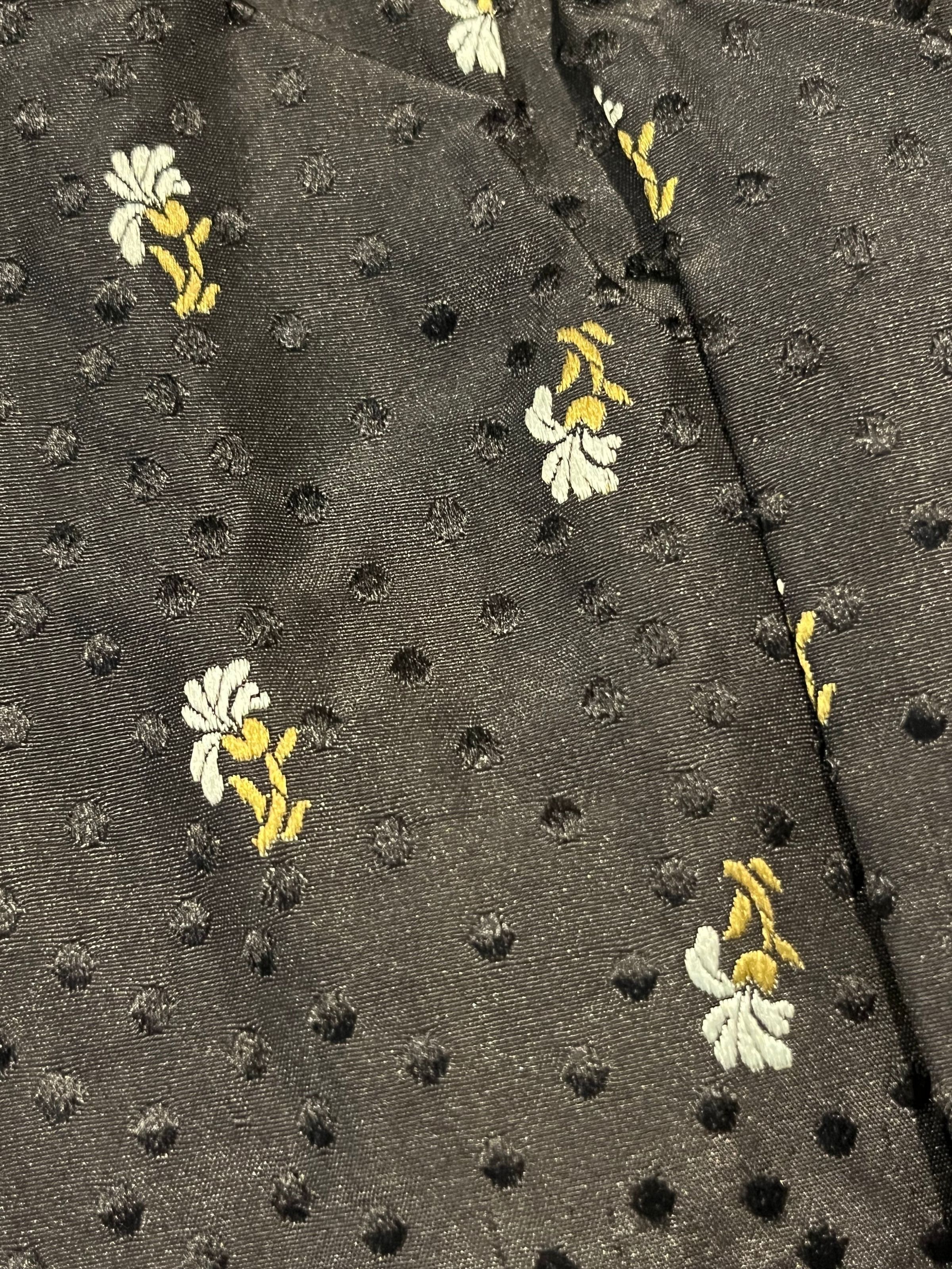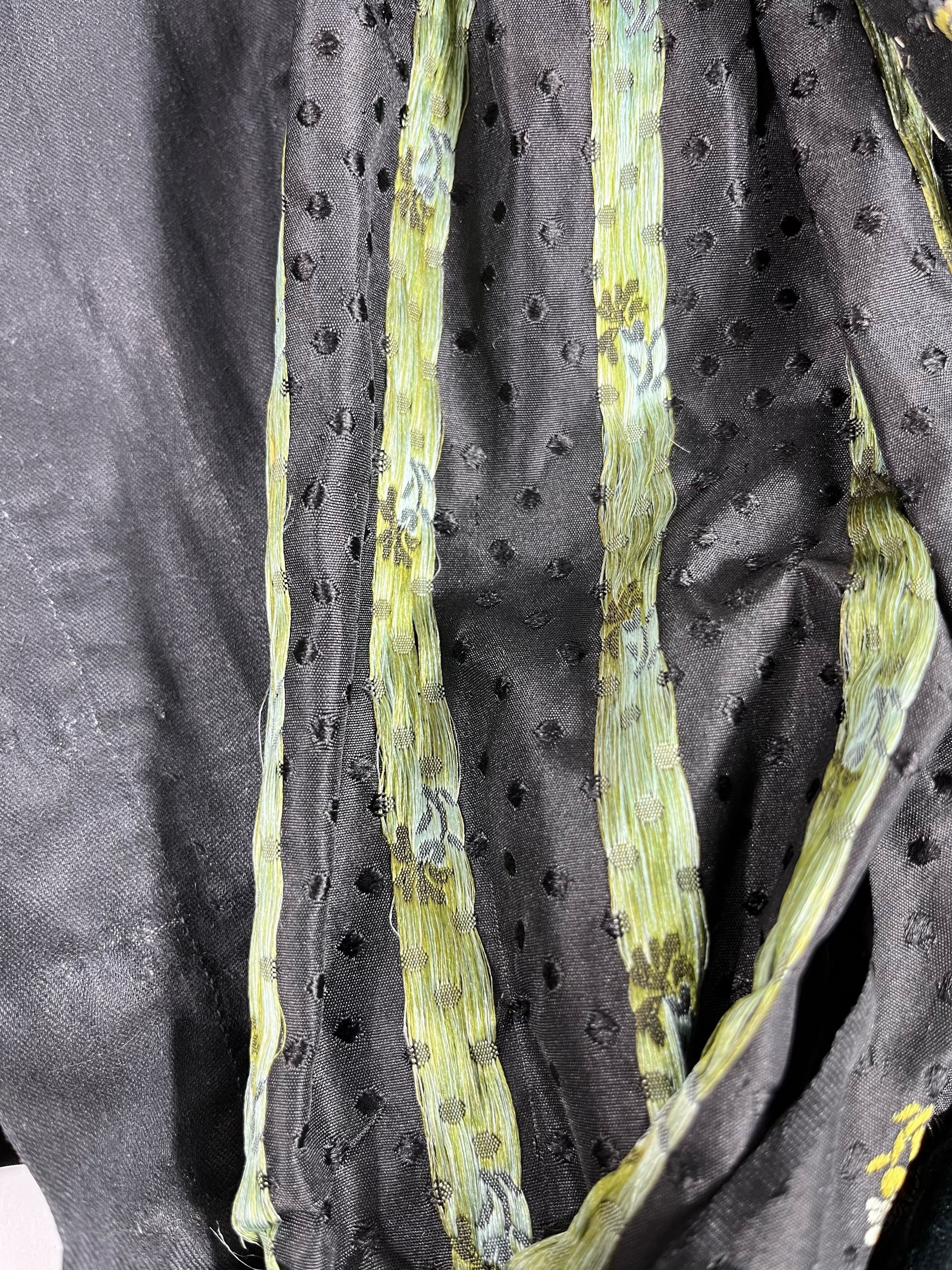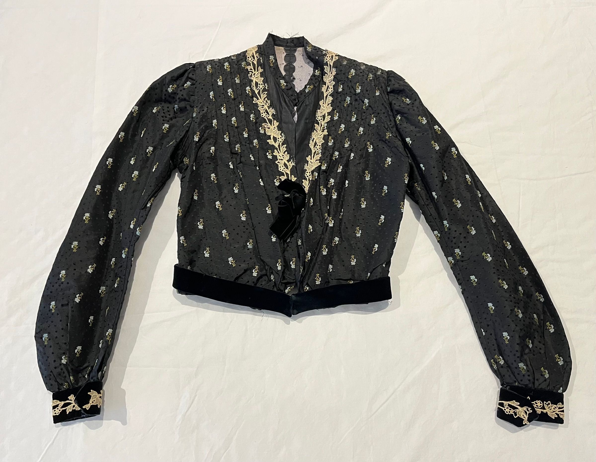 Bodice is of black silk brocaded with blue and green flowers trimmed with lace and black velvet. Short round standing collar of the same brocade sewn to the cotton lining. The bodice opens in the front with an interior black glazed cotton lining with hook and eye closures which is exposed at the top. The interior has no closures .The front of the bodice is pleated, with pleats sewn down at the shoulder and partway down the front. There is trailing floral patterned lace trim applied to the outside edge of the fashion fabric of the V-necked front with a black velvet bow at the bottom. Long sleeves are gathered at the shoulder and end in black velvet cuffs with the same floral lace applique. There is a black velvet bow at the waist; they are all secured with hooks and eyes. Black silk skirt with a short train. The front of the skirt is flat, fitted at the top and flaring out toward the bottom. There are two wide bands of the same fabric sewn above the hem. Lined with black glazed cotton. Closes at the back with hooks and eyes.