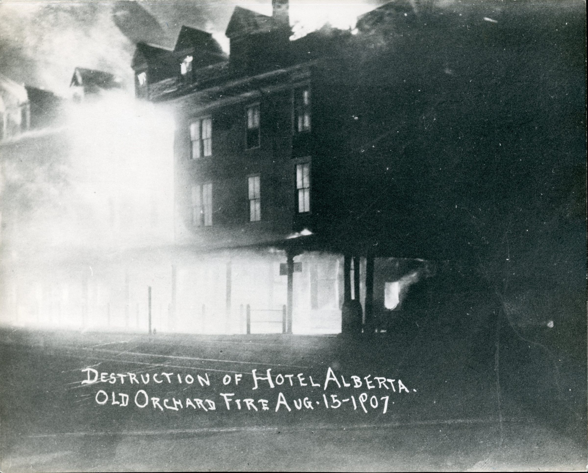Print photograph (produced from a postcard) of the Hotel Alberta engulfed in flames during the Great Fire of August 15, 1907. "Destruction of Hotel Alberta. Old Orchard Fire Aug 15, 1907" is inscribed on the photograph. The hotel was completely burned to the ground in a matter of hours.