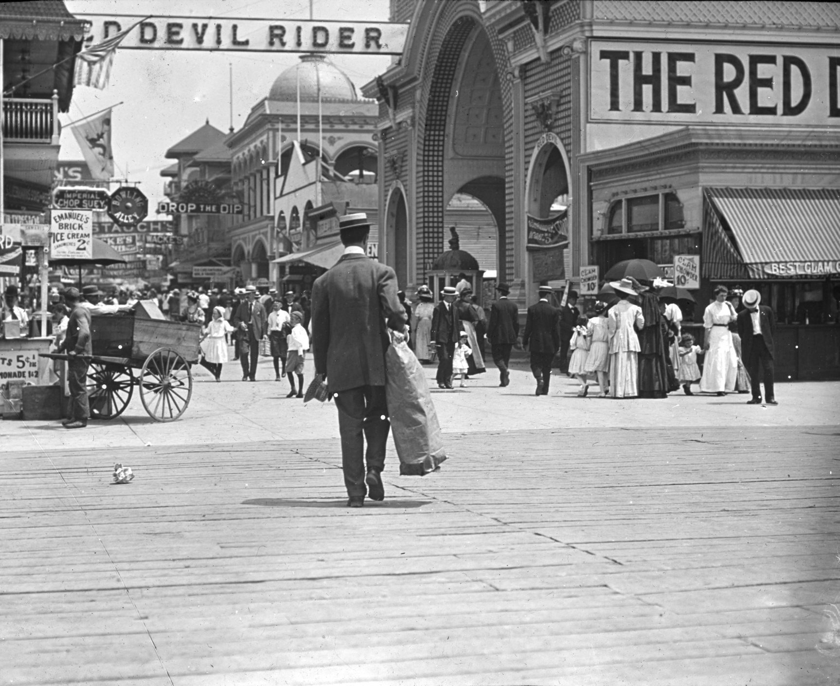 Glass lantern slide photo of The Bowery walk in Coney Island, NY.