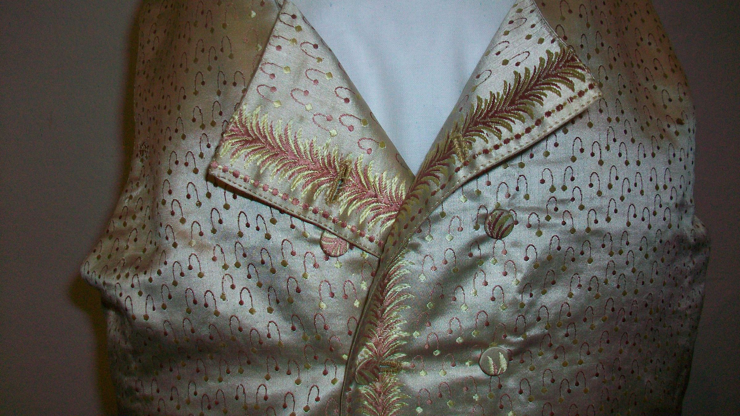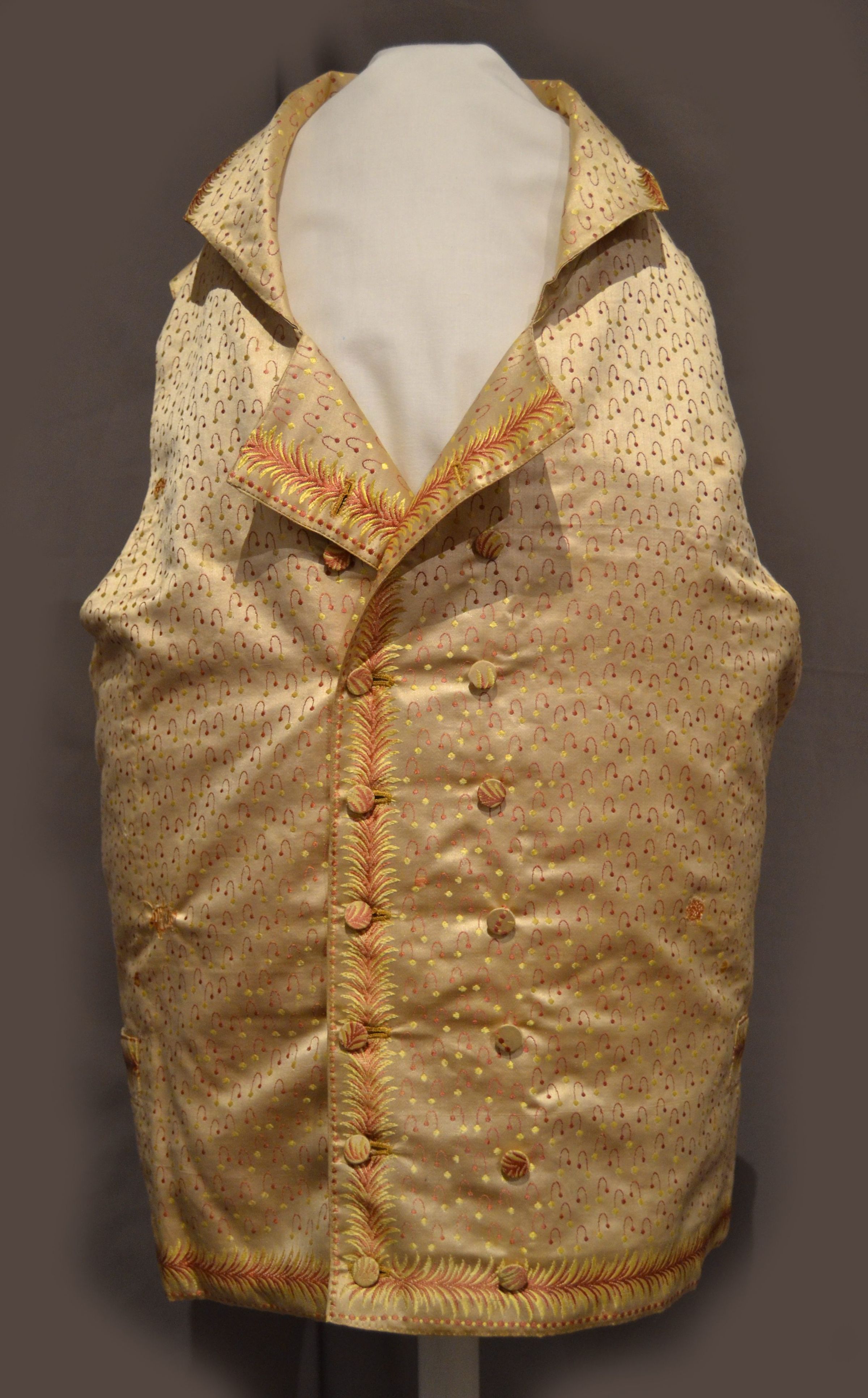 Double-breasted waistcoat or vest. Front is of cream-colored silk brocaded with yellow and pink abstract pattern and vine-like motif as trim around the front edges, hem, and on the pocket flaps; lined with linen. High collar with small lapels. Buttons are covered with the same silk brocade fabric as the front. Back is a plain linen.Material