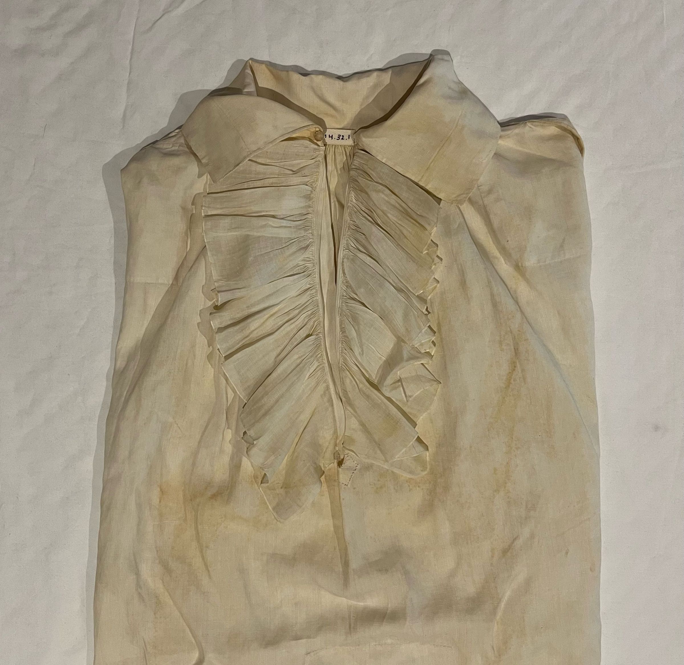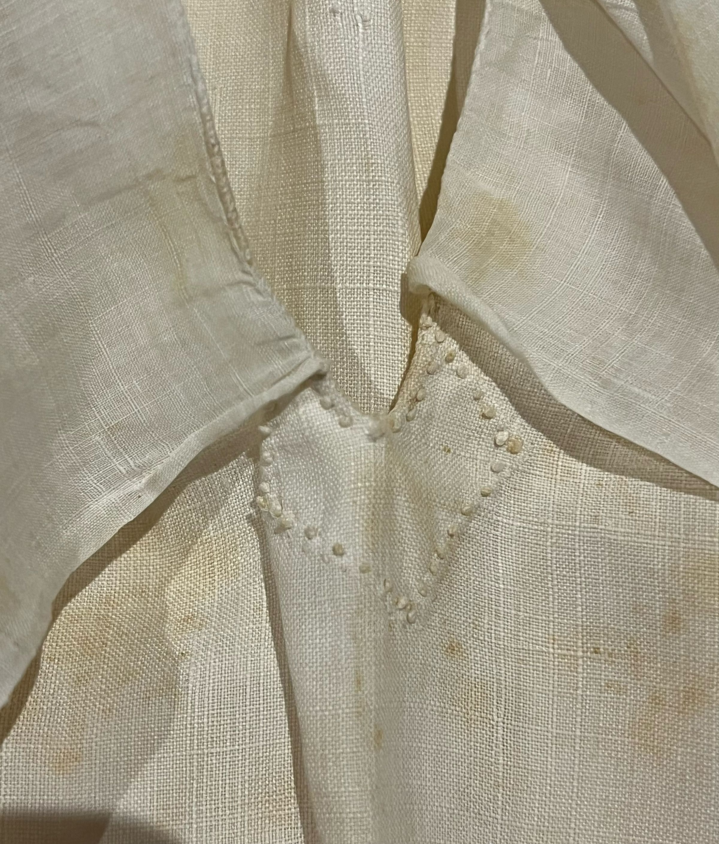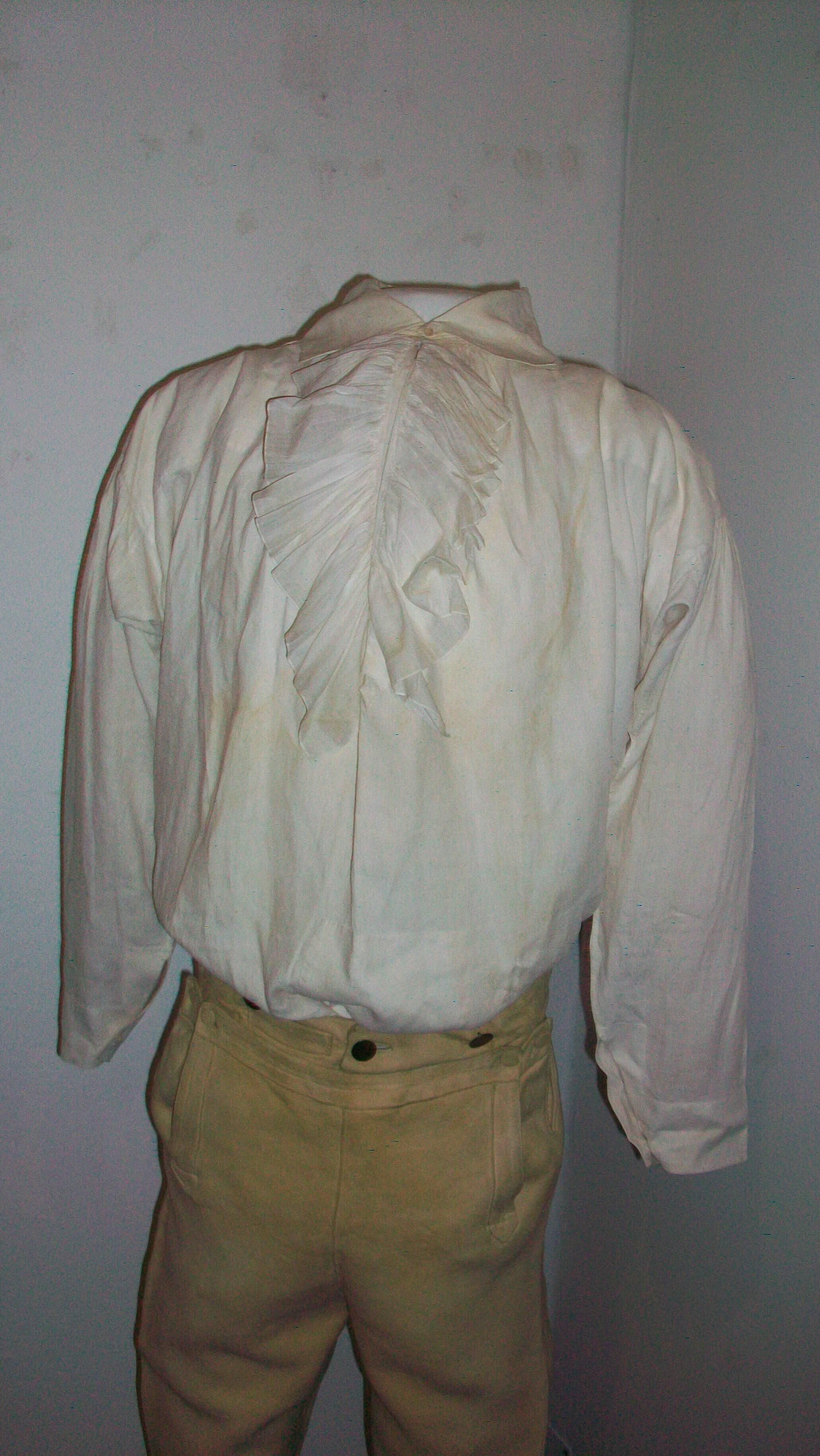 Man's linen shirt with a fine cotton ruffle at the bosom opening. Felled seams. Roughly heart-shaped reinforcement at the bottom of the bosom opening. Made of a full width of linen 30 1/2" wide. Wide collar (4 3/4" wide), designed to be folded down, closes at the top with a single round thread-covered button. Both sleeve cuffs close with a single similar button. Shoulders are reinforced with large patches as are the sides of the sleeve down to the underarm gusset. The sleeves are gathered at the shoulder. There are no gathers at the cuffs. Side vents reinforced with gussets.Dimensions