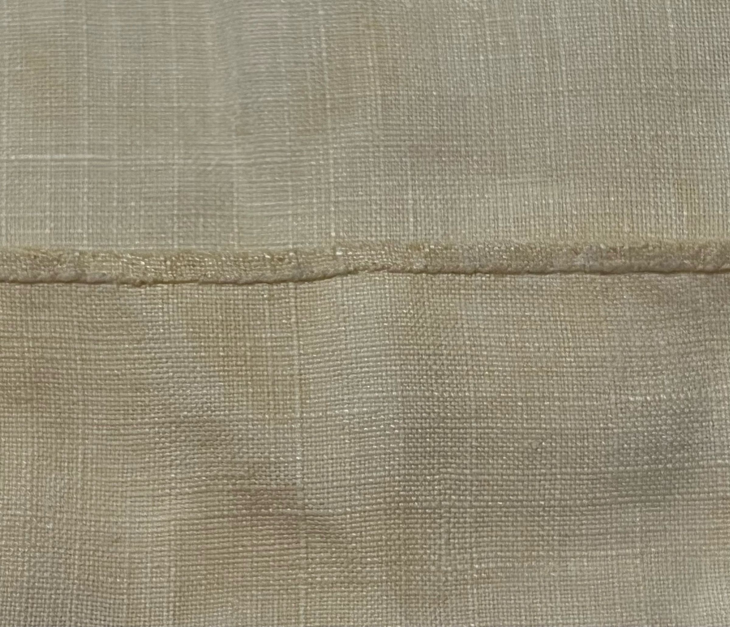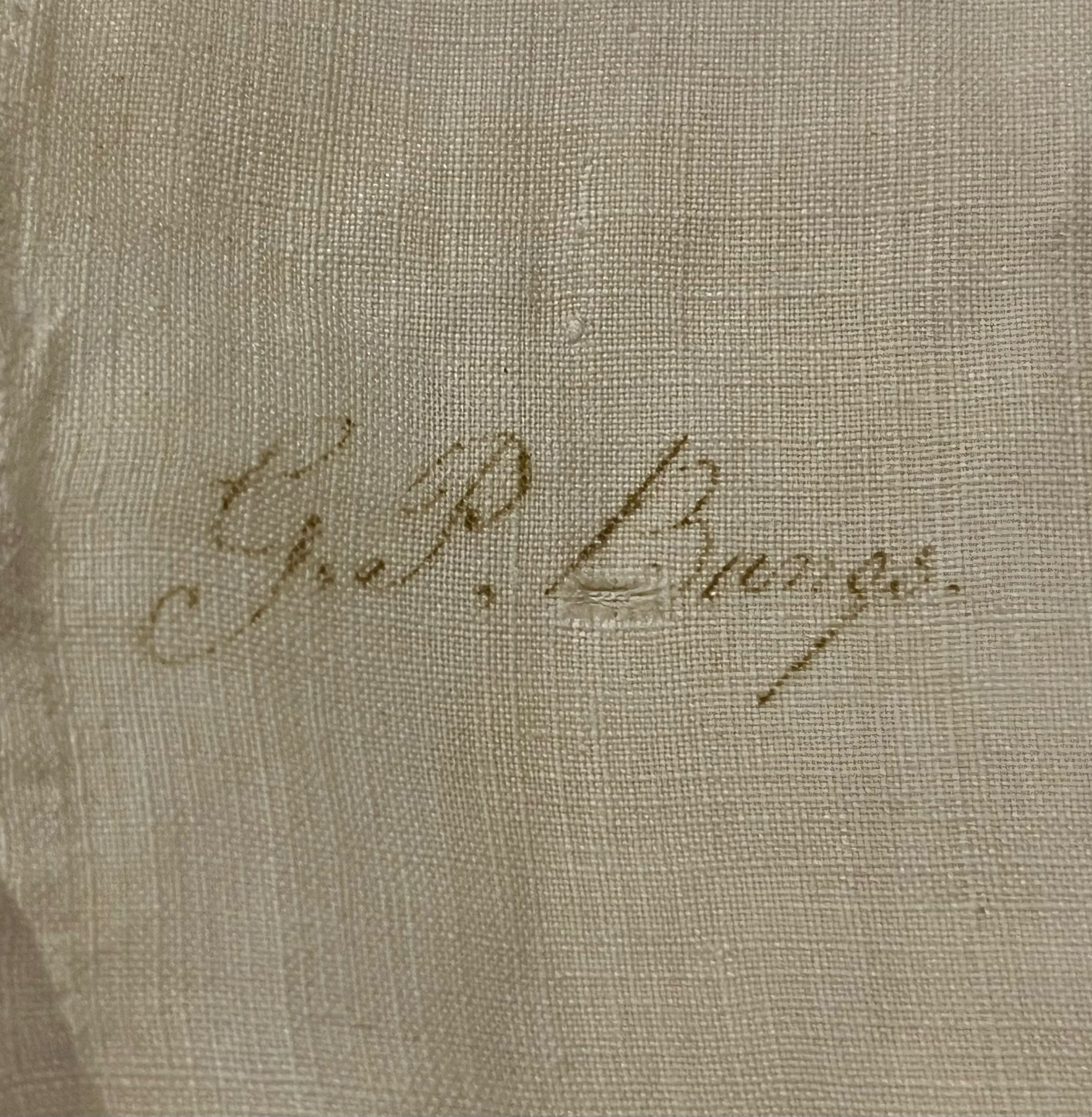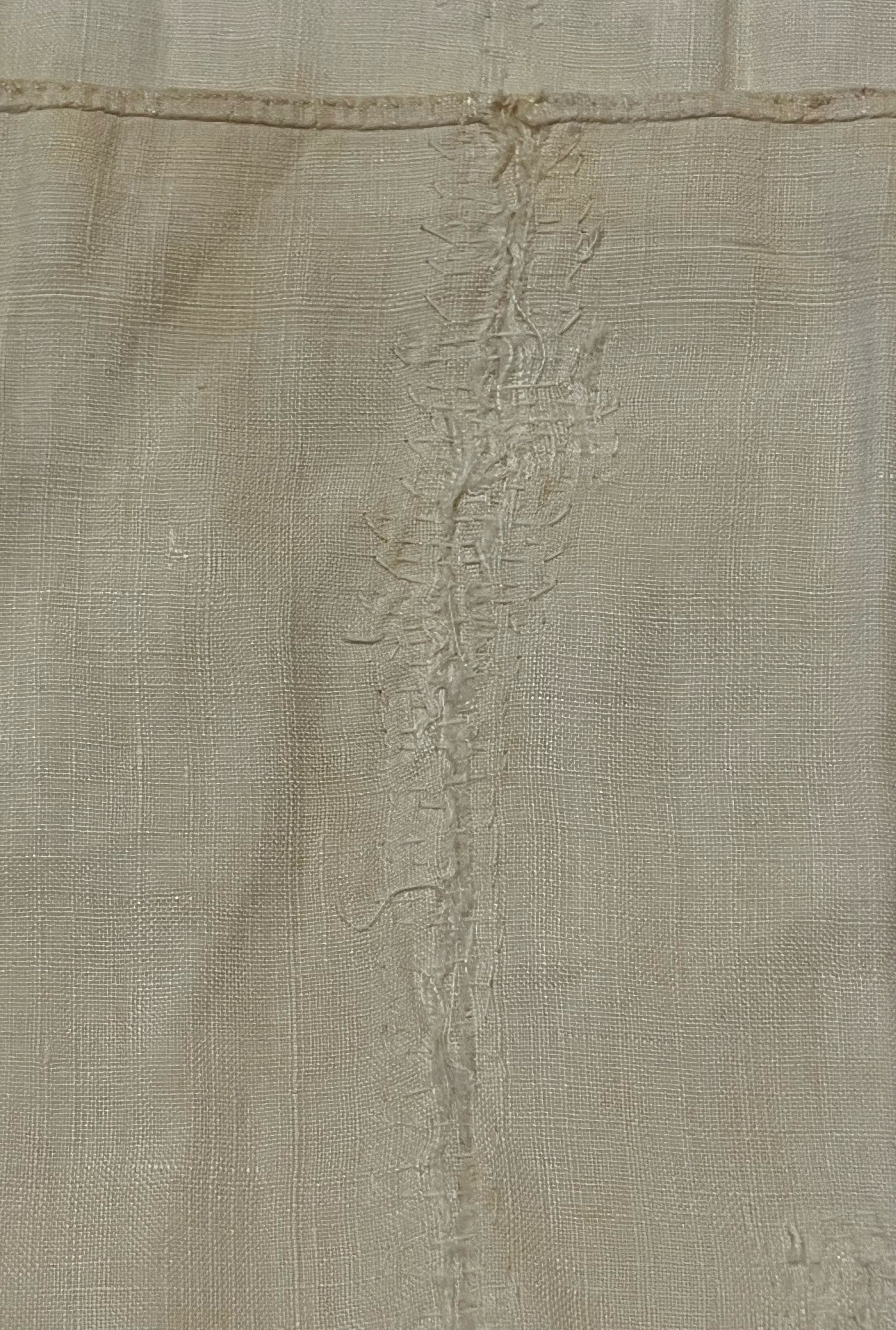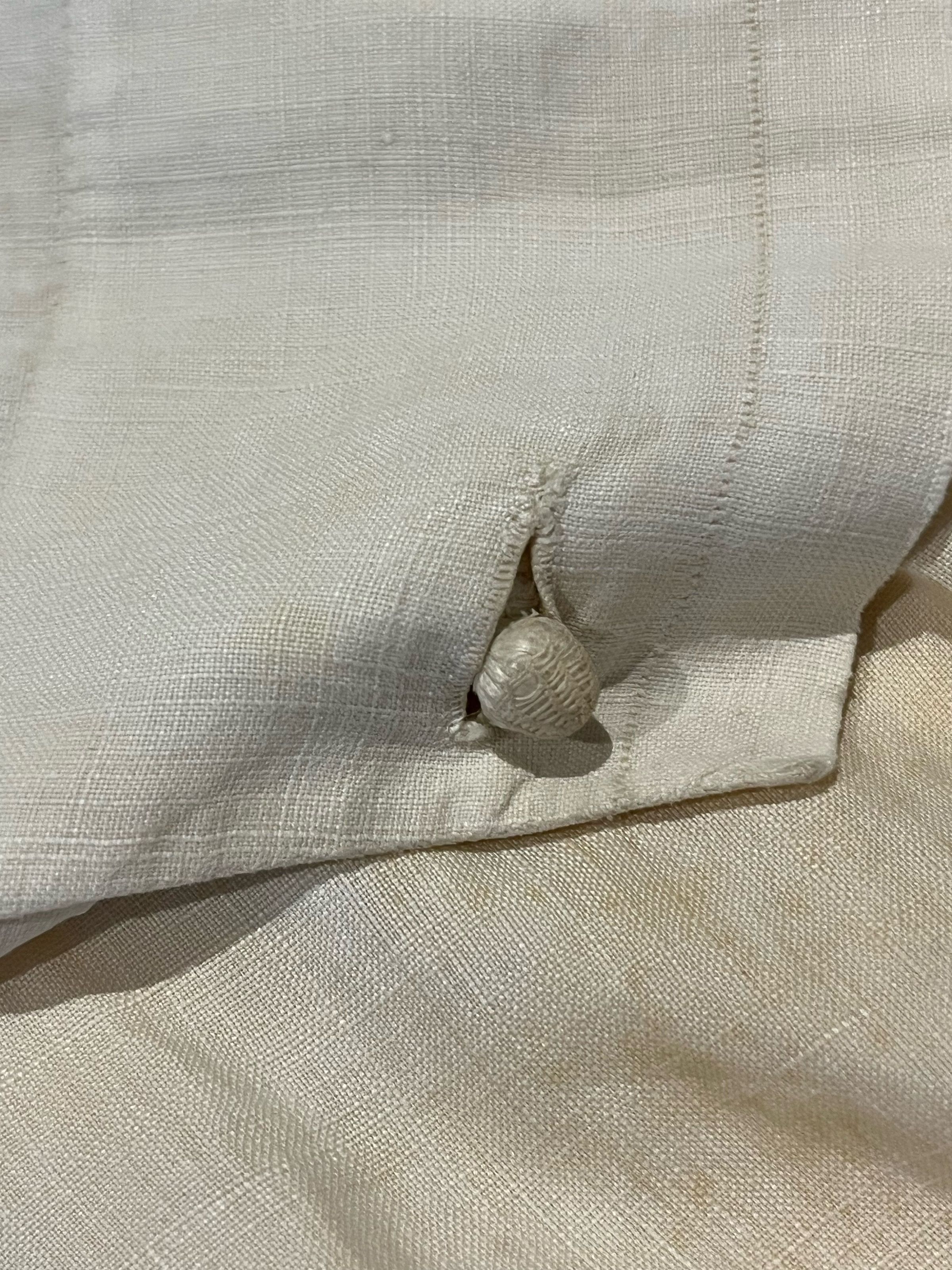 Man's linen shirt with a fine cotton ruffle at the bosom opening. Felled seams. Roughly heart-shaped reinforcement at the bottom of the bosom opening. Made of a full width of linen 30 1/2" wide. Wide collar (4 3/4" wide), designed to be folded down, closes at the top with a single round thread-covered button. Both sleeve cuffs close with a single similar button. Shoulders are reinforced with large patches as are the sides of the sleeve down to the underarm gusset. The sleeves are gathered at the shoulder. There are no gathers at the cuffs. Side vents reinforced with gussets.Dimensions