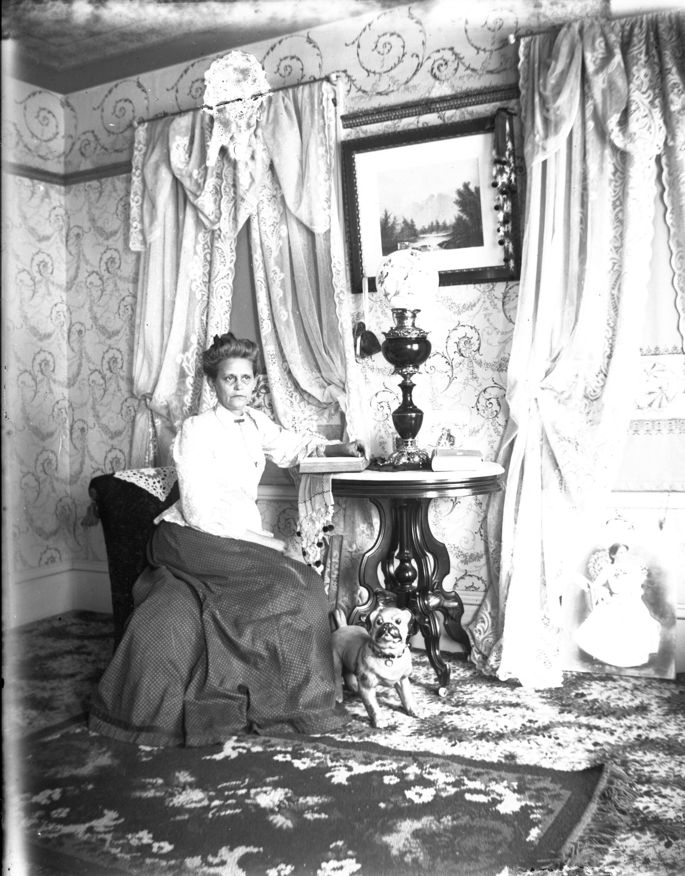 Glass plate negative photo of Sarah Lane Hobbs (1848-1935) taken at 31 Hill Street, Saco, ME, circa 1904.
