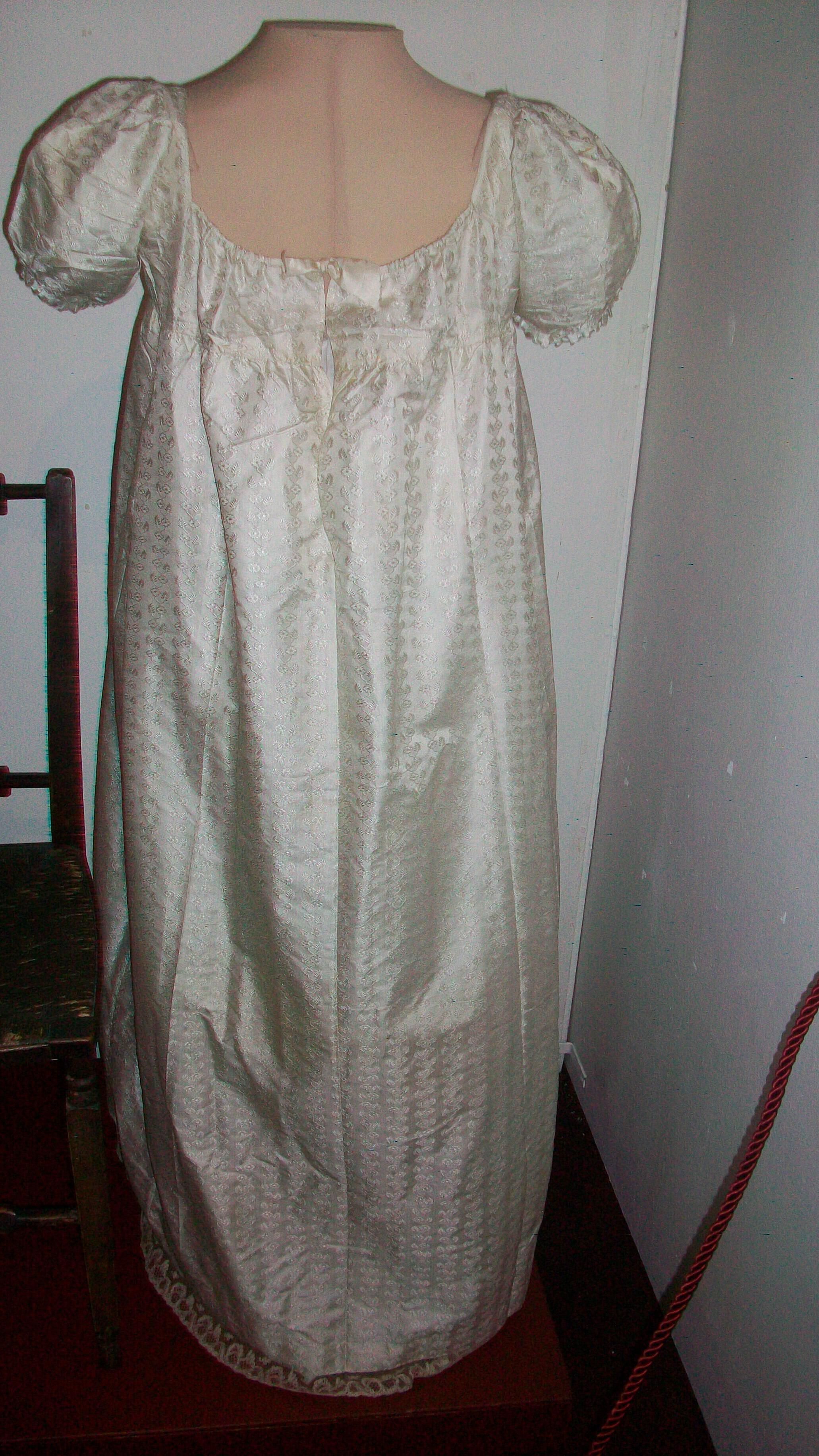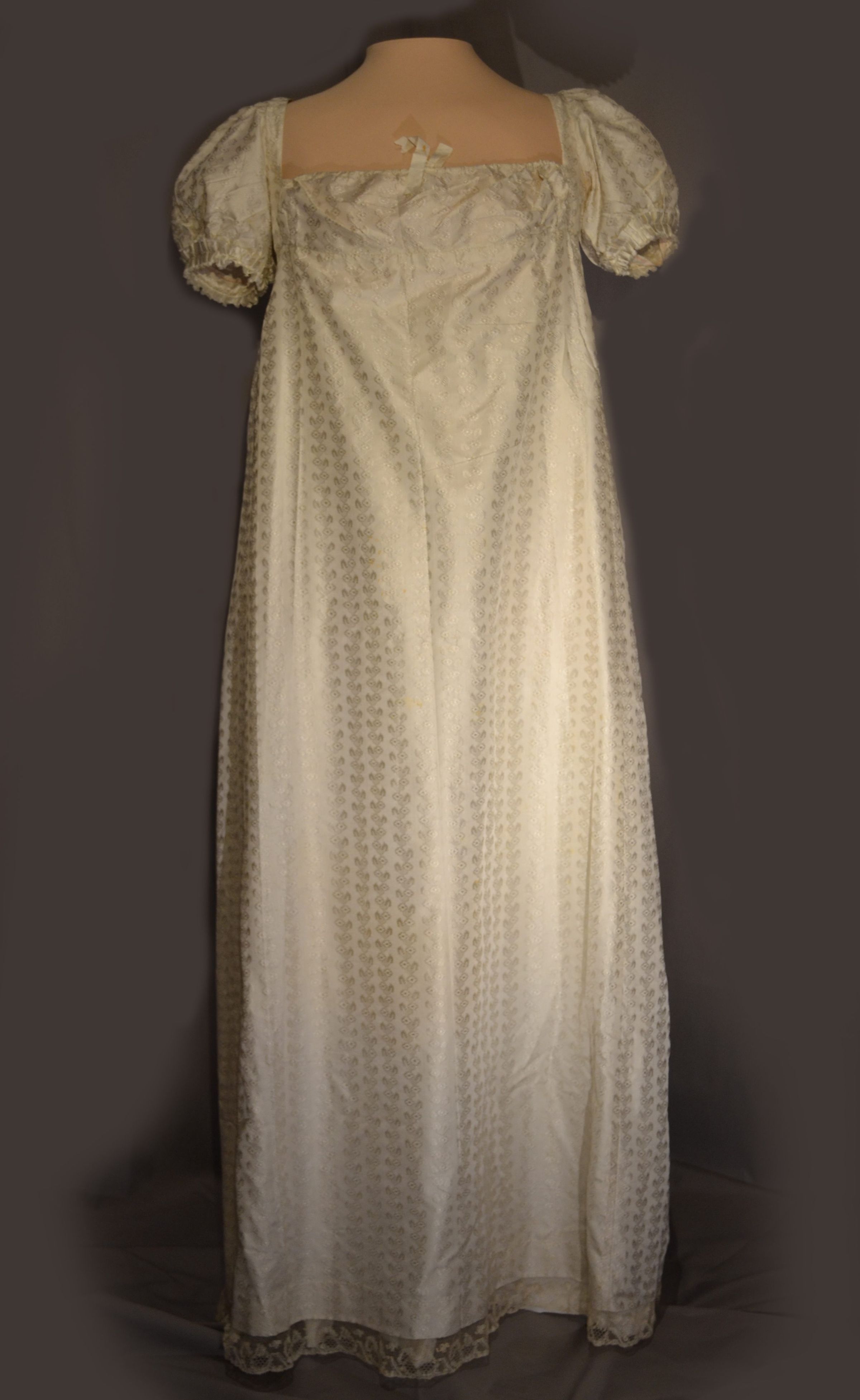 This dress exemplifies the classically-inspired simplicity of the early 19th century. With its high waistline and low gathered neckline, it is made of a light-weight pattern-woven silk, and would have clung to the body of the woman who wore it. The only trims are the box-pleated ivory silk ribbon on the sleeves and the narrow ivory lace that edges the hem. Hairstyles and accessories also underwent great changes in this period. Most women cut their hair short and wore it close to the head, often with feathers and turbans for decoration. Flat slippers of fine kid or satin were the fashionable choice, a type of footwear that was highly inappropriate for the winter climate of northern New England. Woven shawls also became a popular—and warmth-providing—accessory. Worn with a pair of flat slippers in a contrasting color and a vividly bordered shawl, this dress would have been the centerpiece of a most fashionable ensemble.