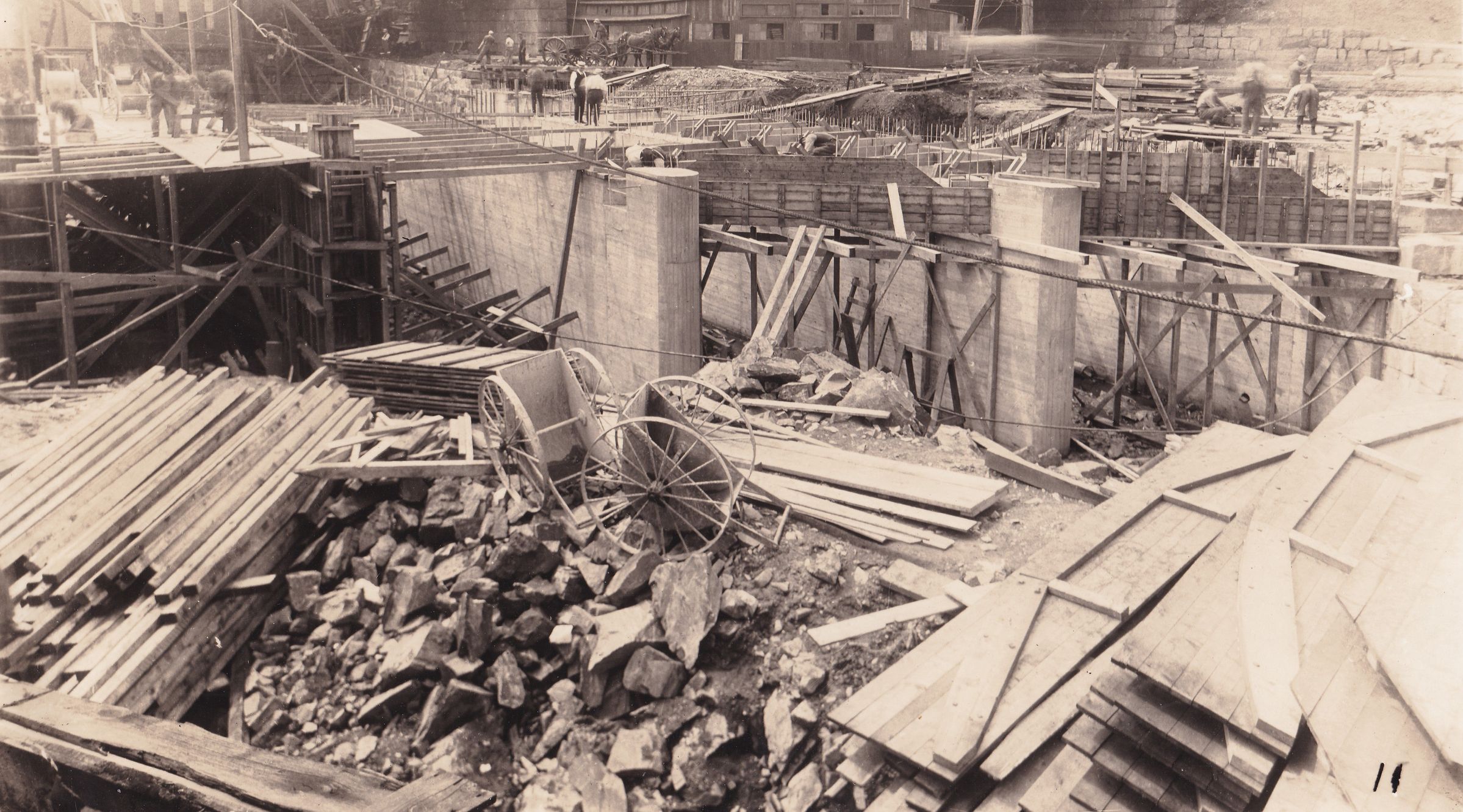 Aerial view of the foundation of the "New Shop" looking east.Made/Created