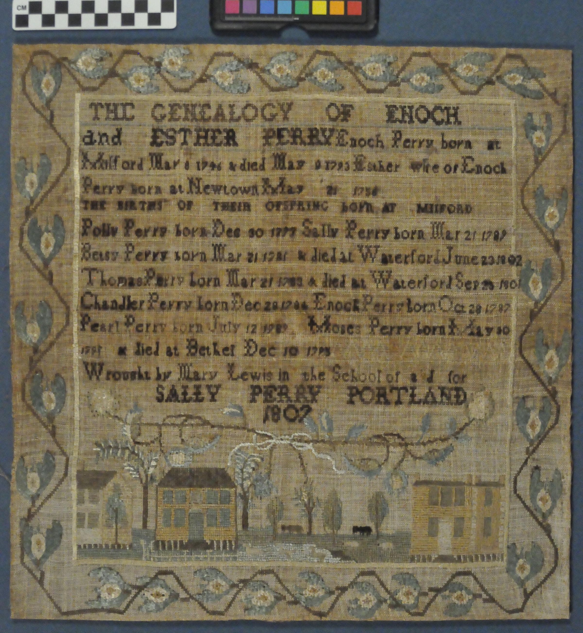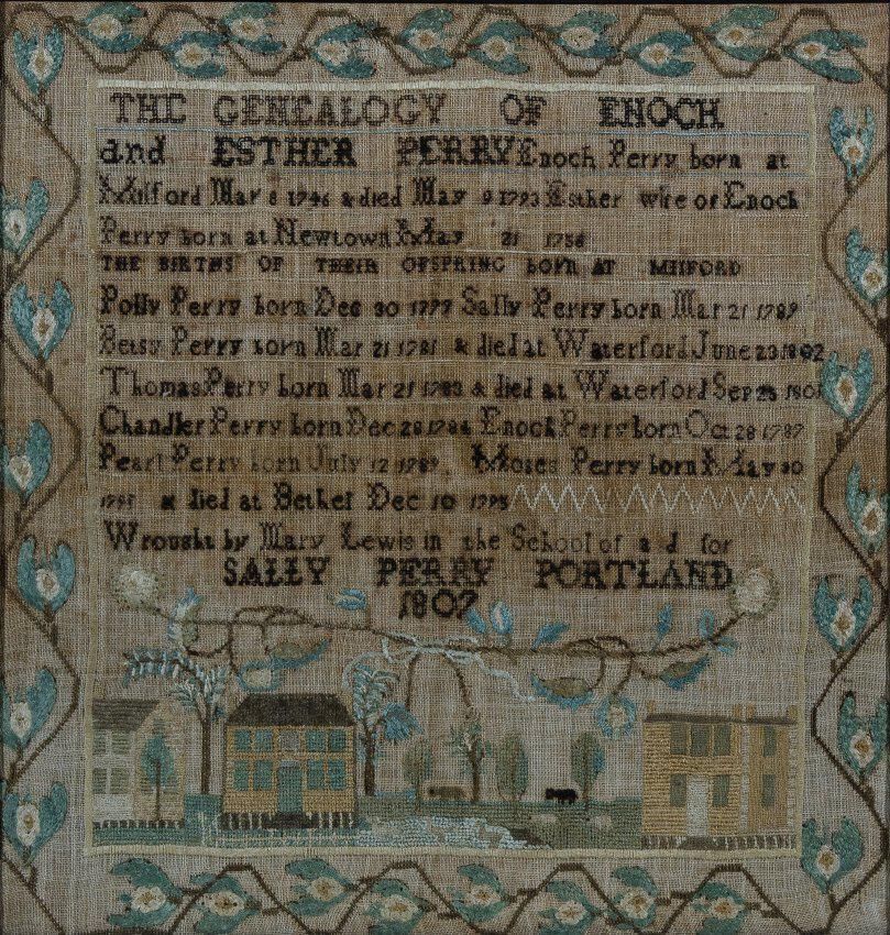 Mary Lewis stitched a very unusual genealogical sampler at the school of Sally Perry. Rather than provide information about her own family, she chose instead to tell the story of her teacher’s family, and then gave the finished sampler to Sally Perry as a wedding gift. Nothing is known of Mary, since she provided no information to help identify her. She may have been the daughter of Ansel Lewis and Comfort Manchester of Portland, born October 29, 1797, who married Job Thomes on November 10, 1812. At least three other samplers from Perry's school are known.Label Type