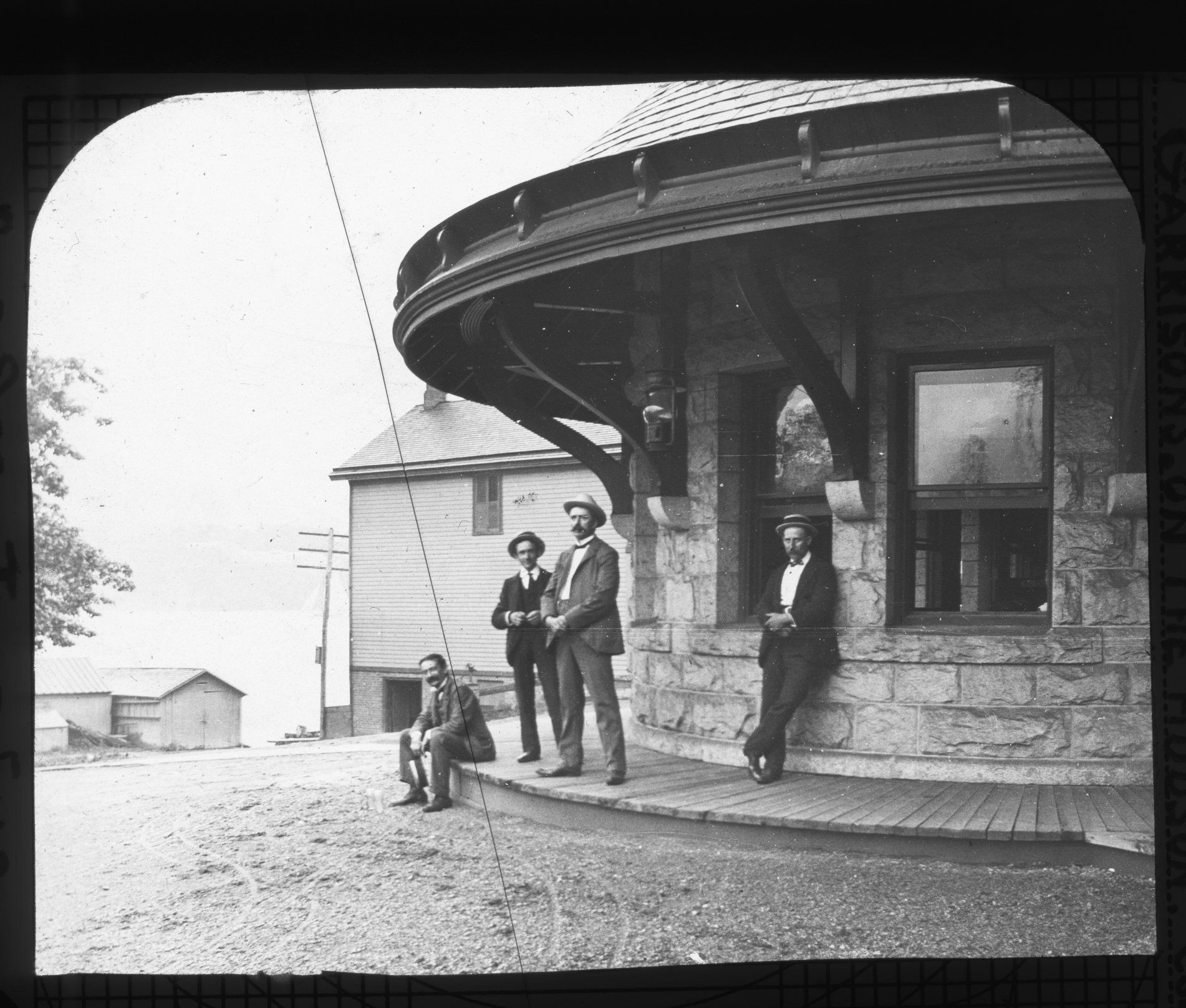 Glass lantern slide of a four unidentified men in front of a stone building. "Garrisons on the Hudson - contact one second time exp." is written on the label on the slide. The photo was taken at Garrison Hotel in Garrison, NY.