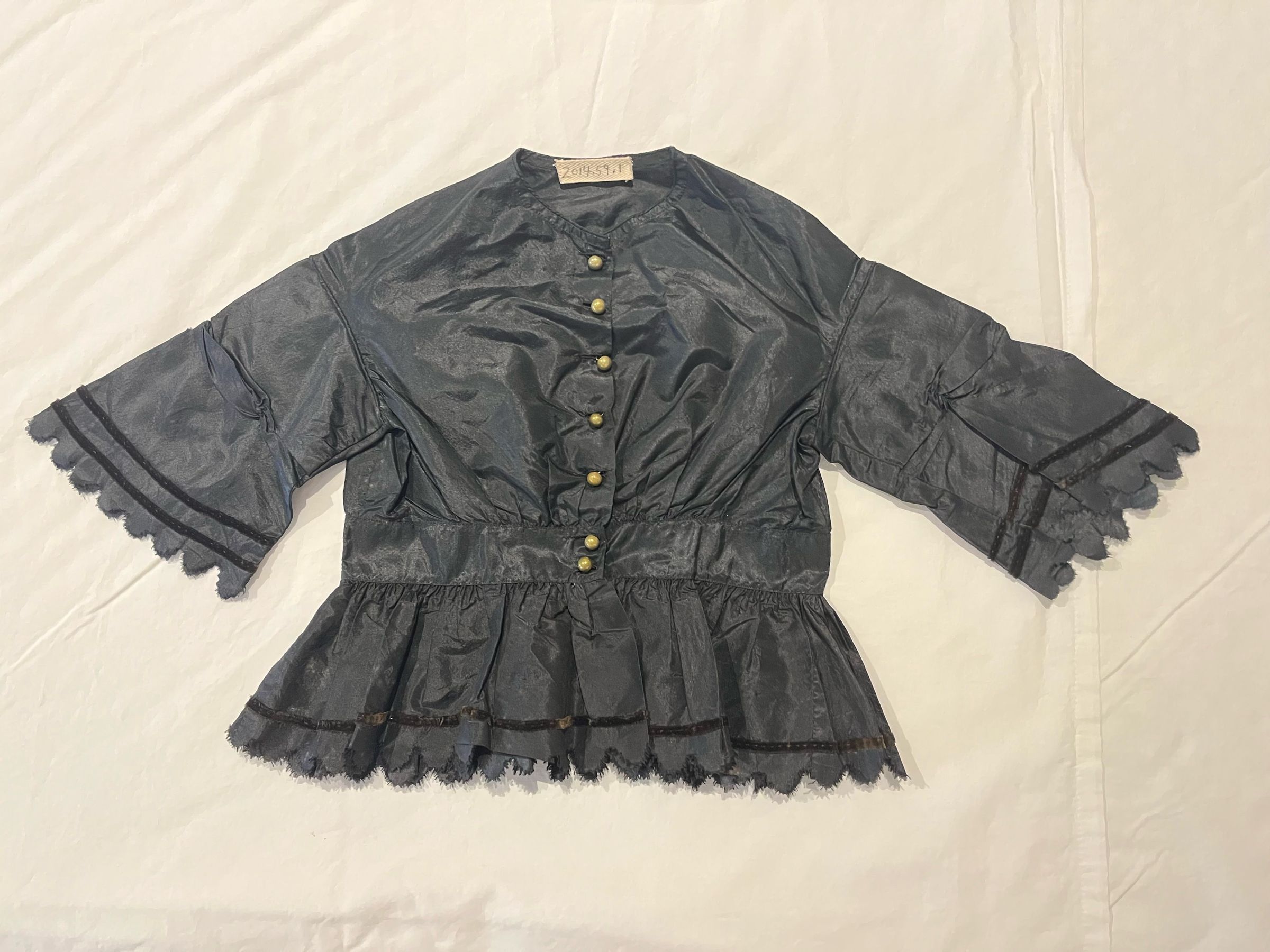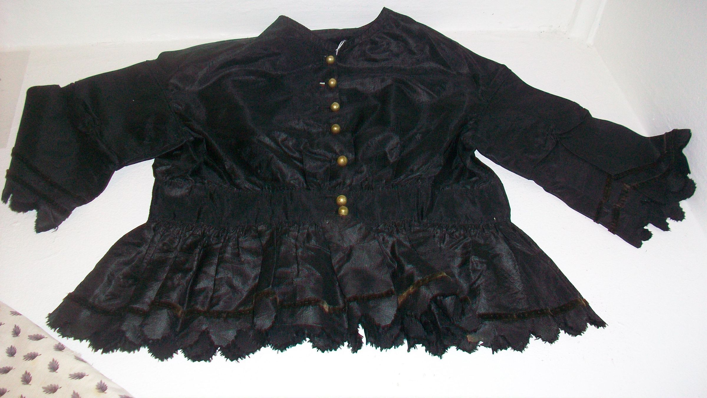 Boy's black silk tunic, buttoned to the waist with 7 round brass buttons. Four inch skirt with pinked scalloped edging above which is a narrow black velvet ribbon. Round piped neckline. Sleeves are piped at the dropped shoulder and have the same pinked scalloped edging and velvet ribbon trim.