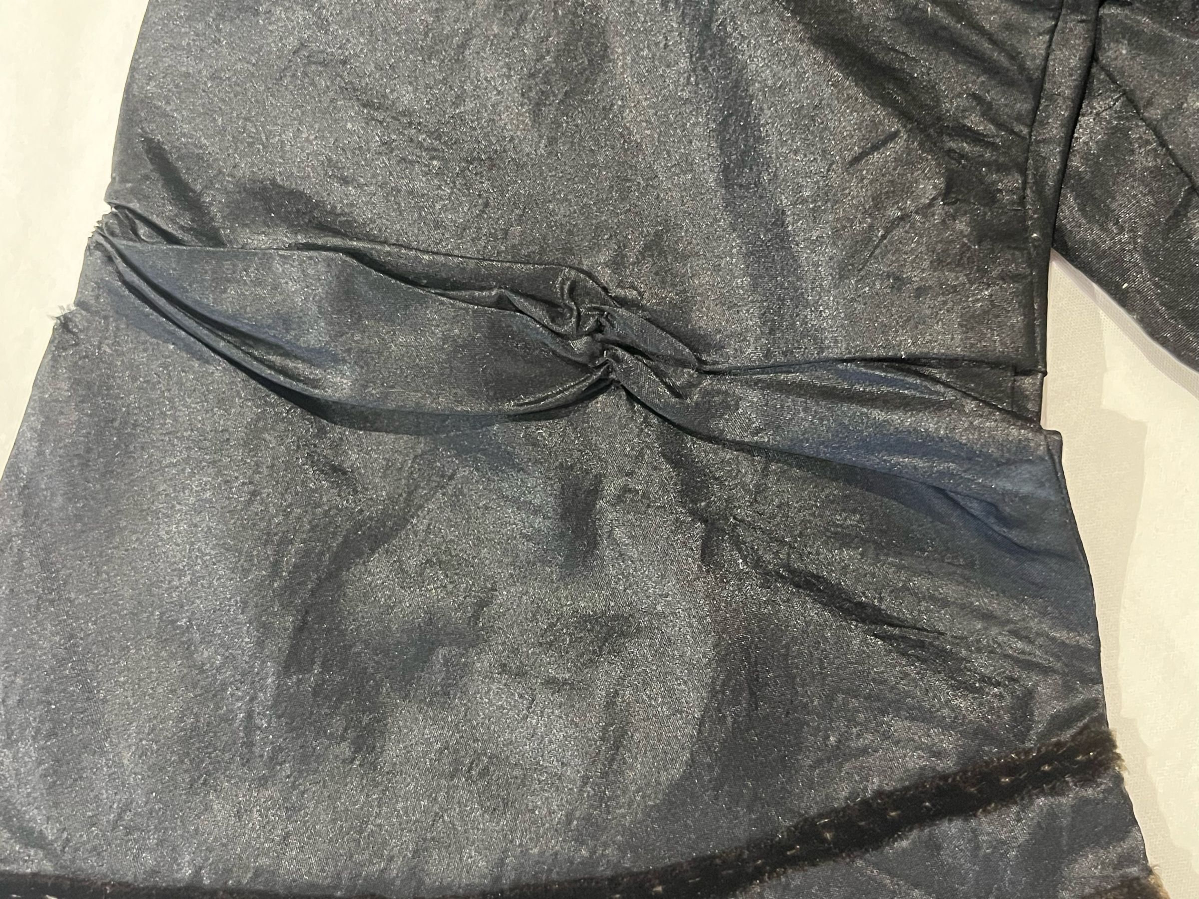 Midway down the sleeve the fabric is gathered into three evenly spaced sections much like ribbon trim. Unlined.Dimensions