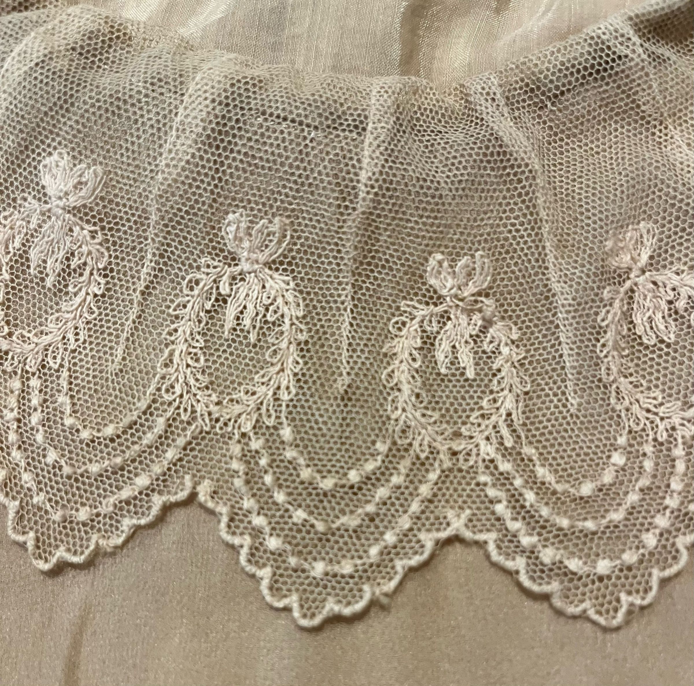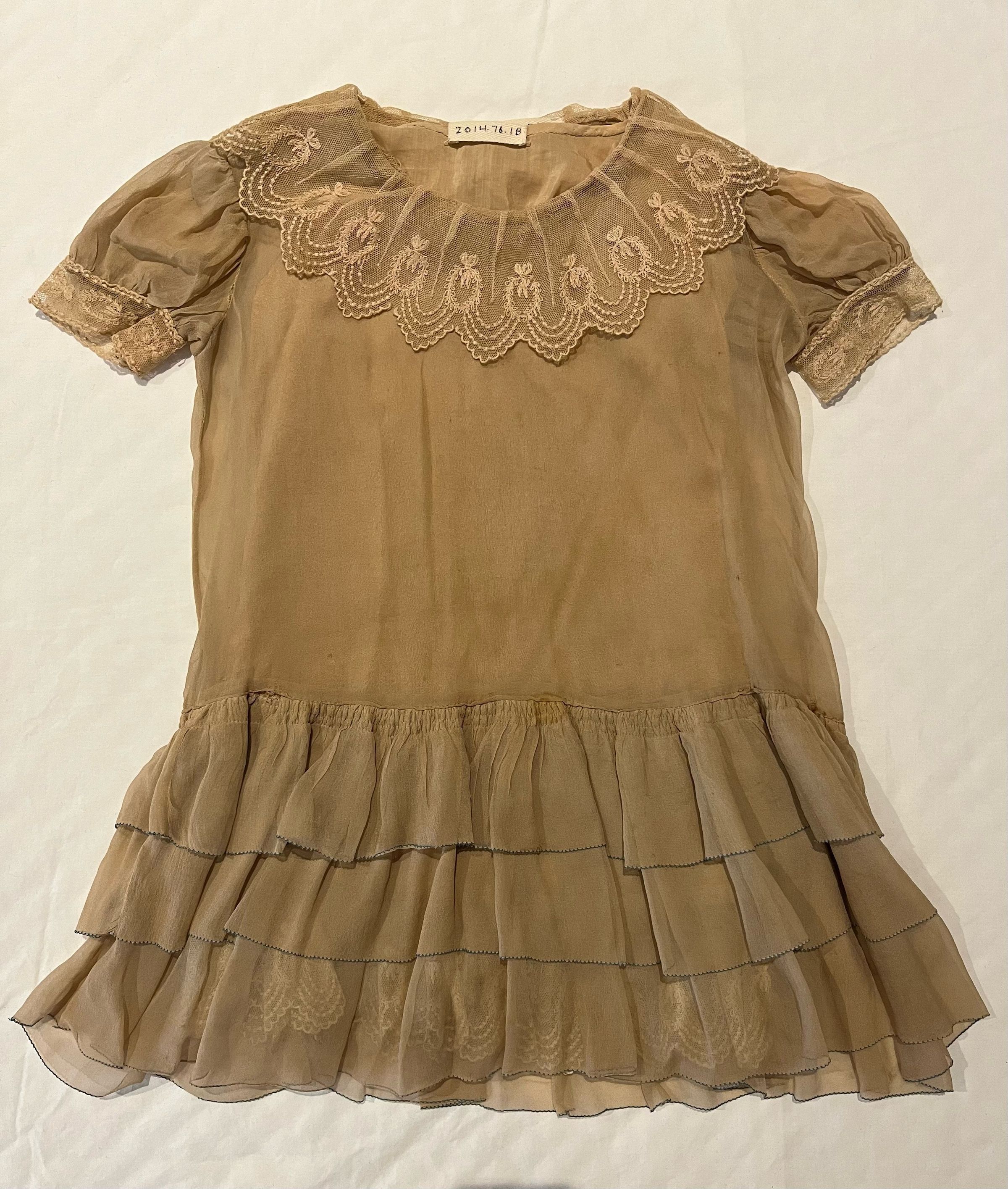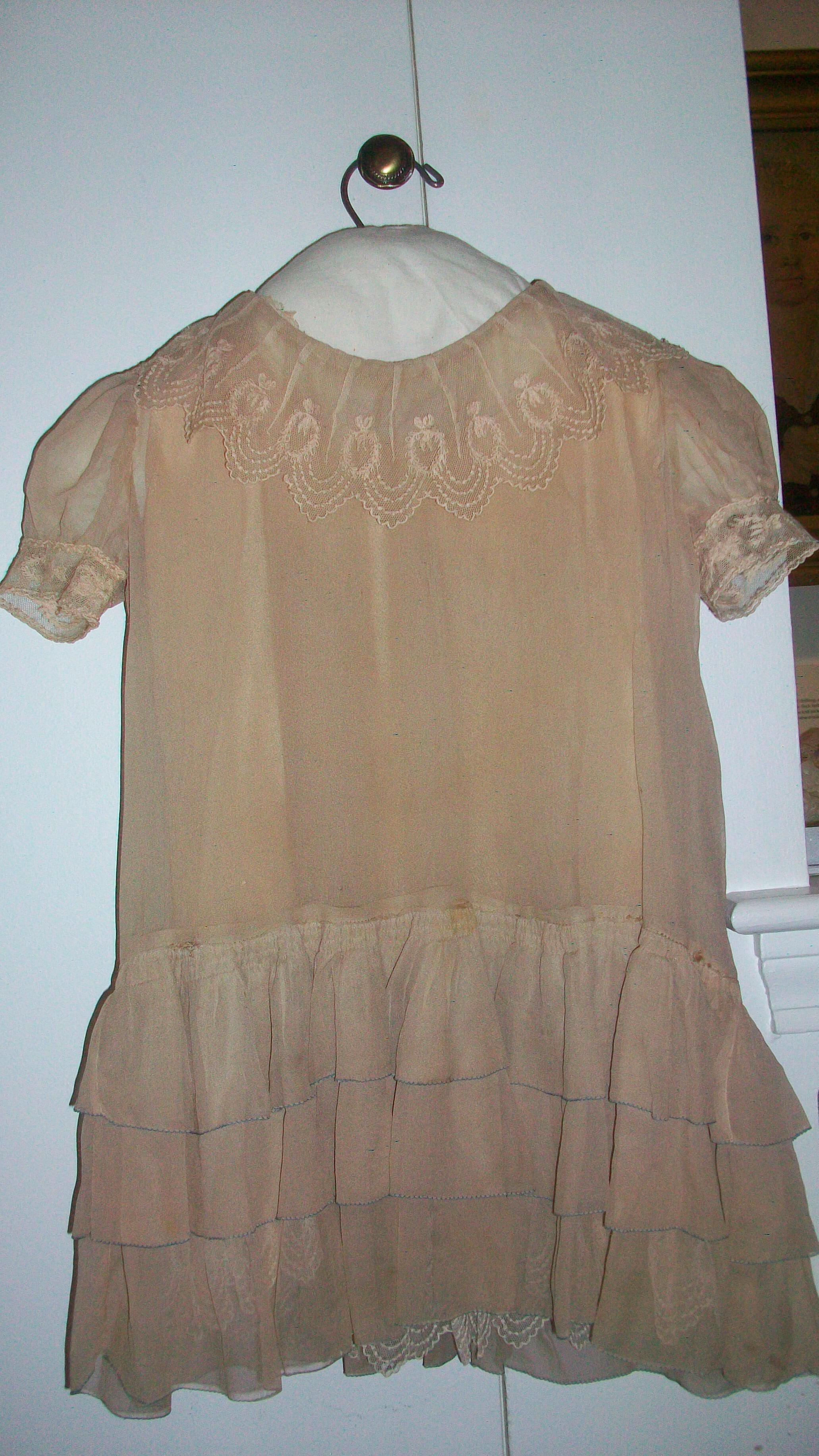 Silk chiffon dress with short puffed sleeves and a dropped waist, trimmed with lace around the neck and with three rows of ruffles around the skirt. Matching silk under slip trimmed with the same lace as the collar of the dress.Material