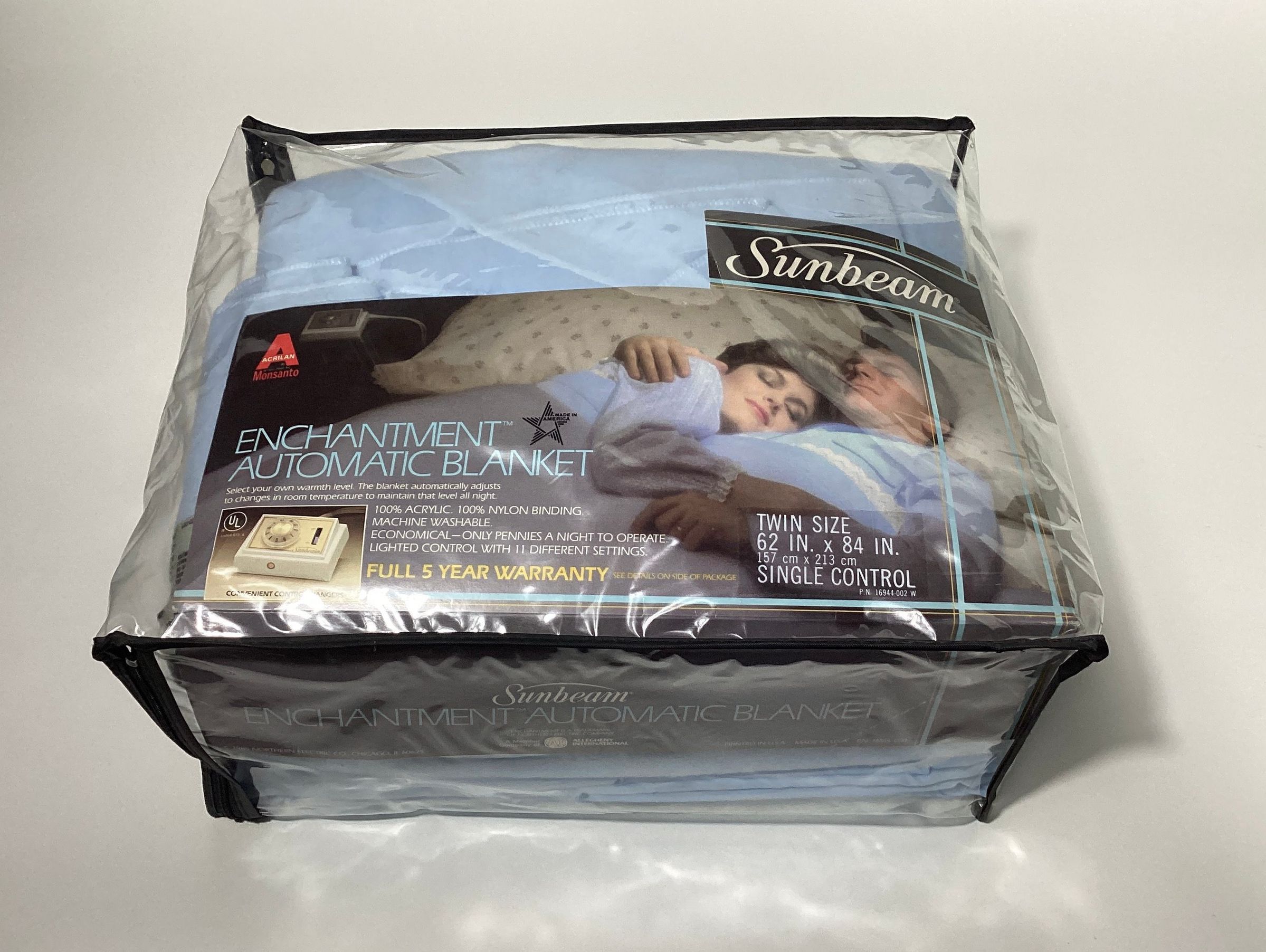 Twin size light blue Sunbeam Enchantment Automatic Blanket in its original vinyl zippered package and with its interior paper label.