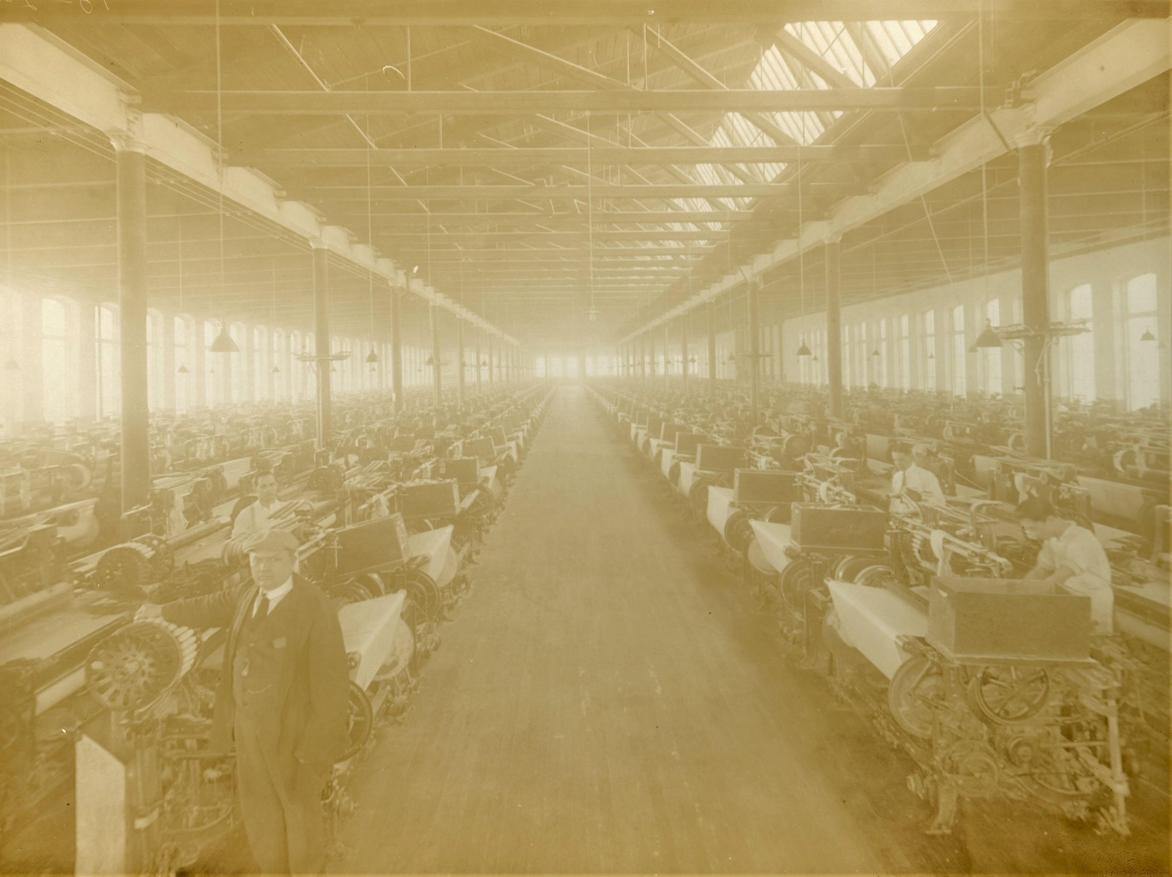 Photograph of workers in a weaving room in the Laconia Division of the Pepperell Manufacturing Company.