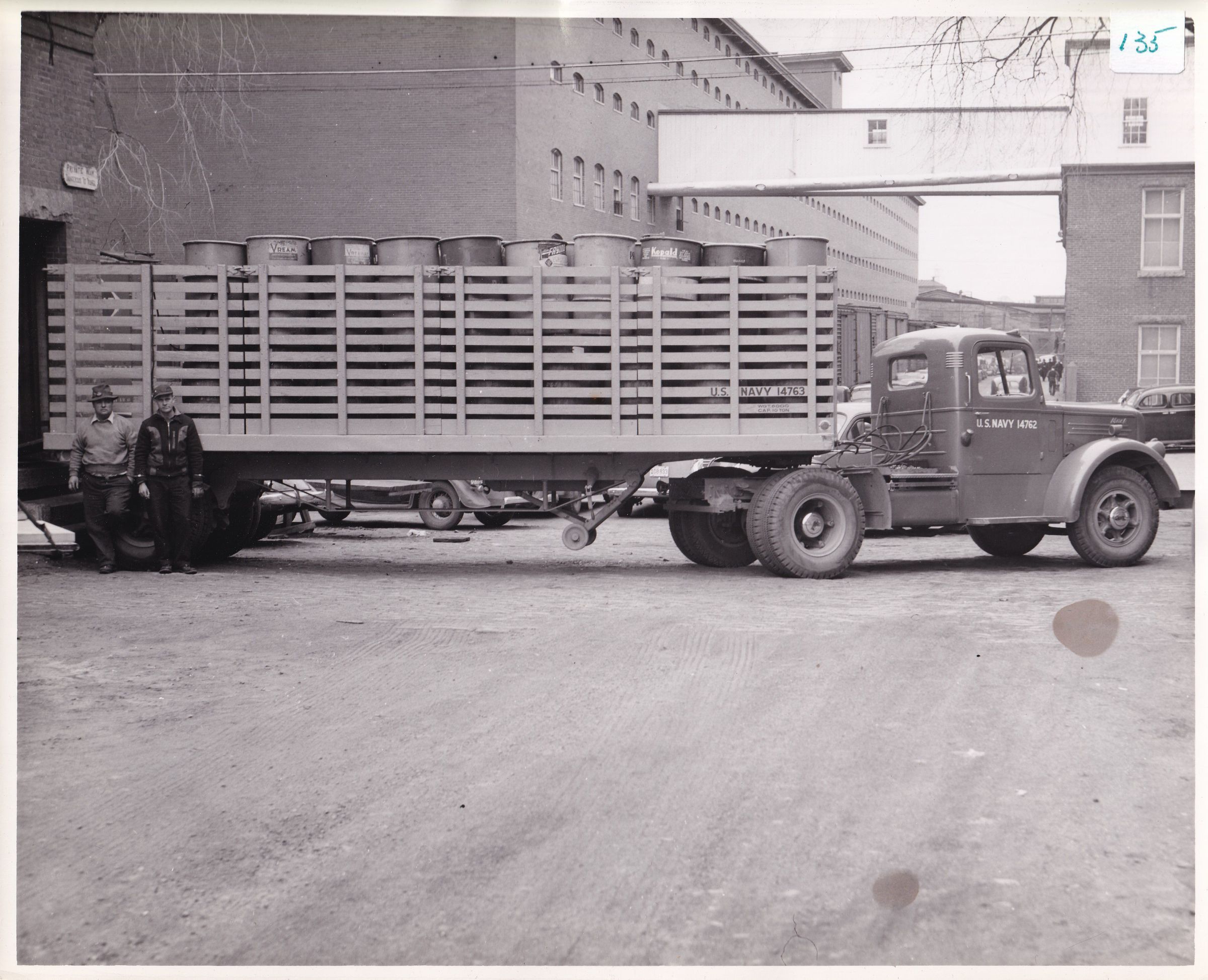 A Navy truck hauling away products involved with the Vasco Da Gama Project of reclaiming scrap metal during World War 2. The truck is near Lincoln Street, looking between the Pepperell Cotton Storehouse on the left (later the site of MERC) and another Pepperell building, with the front of the Saco-Lowell Foundry in the distance.Made/Created
